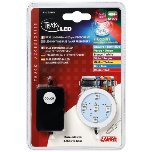 Ειδική βάση φωτιζόμενη με επιλογή 7 χρωμάτων (γαλάζιο, πράσινο, λευκό, μωβ, κίτρινο, μπλε και κόκκινο) για να στηρίζετε το γυάλινο μπουκάλι με το αρωματικό της σειράς TRUCKY και να διακοσμείτε υπέροχα την εσωτερική καμπίνα του οχήματός σας. Τη συνδέετε με φις στην υποδοχή του αναπτήρα 12/24V, μετατρέποντας το αρωματικό σε ένα ιδιαίτερο στολίδι για το όχημά σας, χαρίζοντάς του στυλ και πρωτότυπη εμφάνιση! Διαθέτει καλώδιο 150 cm και αυτόκολλητη ταινία διπλής όψης στο κάτω μέρος για να τοποθετείται στο ταμπλό του οχήματος ή να στερεώνεται σε οποιαδήποτε άλλη λεία οριζόντια επιφάνεια άμεσα και γρήγορα, χωρίς κίνδυνο πτώσης, κτλ. Ιδανικό προϊόν για να δημιουργεί ευχάριστη ατμόσφαιρα! Εύκολη και γρήγορη χρήση.