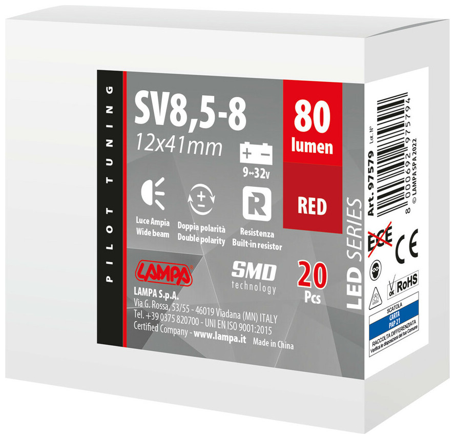 ΛΑΜΠΑΚΙΑ ΠΛΑΦΟΝΙΕΡΑΣ 9>32V SV28,5-8 2SMDx1CHIP LED 80lm CAN-BUS 12x41mm ΚΟΚΚΙΝΟ ΚΟΥΤΙ LAMPA - 20 ΤΕΜ.