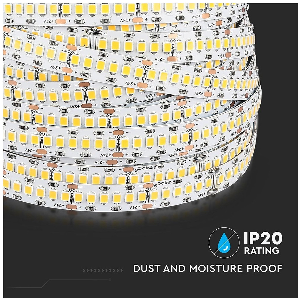 V-TAC PRO SKU 333 LED Strip , μια επιλογή φωτισμού που συνδυάζει υψηλή απόδοση και πρακτικότητα. Με συνολική ισχύ 180W συνολικής ( 18W/m ) και τεχνολογία Samsung SMD2835 LED Chip , αυτή η λωρίδα LED προσφέρει φωτεινή ροή 1500 lm/m ( συνολικά 15000 lm ) στα 24 V και δέσμη φωτός 120° . Δυνατότητα κοπής κάθε 2,5 cm , επιτρέποντας άνευ προηγουμένου ευελιξία εγκατάστασης, με πάχος 10 mm με βαθμό προστασίας IP20 προσαρμοσμένο για εσωτερικούς χώρους. Χάρη στον λόγο απόδοσης φωτός 83 lm/W και τη θερμοκρασία χρώματος (CTI) 6400K και τον υψηλό δείκτη απόδοσης χρωμάτων CRI>95 , εξασφαλίζει βέλτιστη φωτεινότητα με μειωμένη κατανάλωση ενέργειας. Το πηνίο προσφέρει μήκος 10 μέτρα και 240 LED/m . Εξοπλισμένο με κόλλα στο πίσω μέρος για εύκολη εφαρμογή και σύνδεση με το δίκτυο μέσω καλωδίων συγκόλλησης, προσαρμόζεται τέλεια σε ένα ευρύ φάσμα περιβαλλόντων.