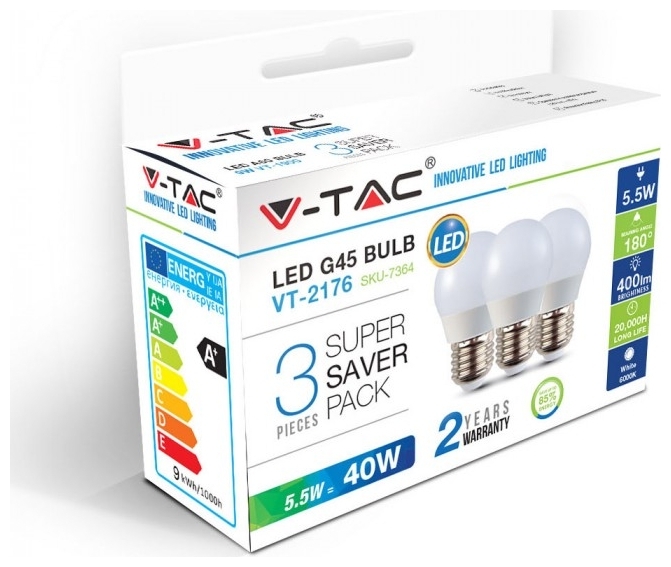 LED V-TAC Λάμπα Ε27 5.5W (G45) Πακέτο 3 τεμαχίων Θερμό Λευκό 7362