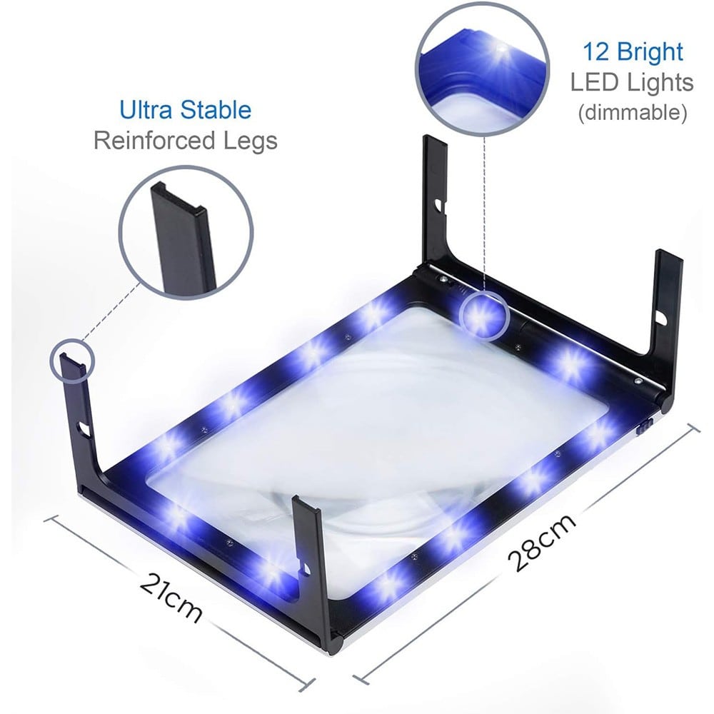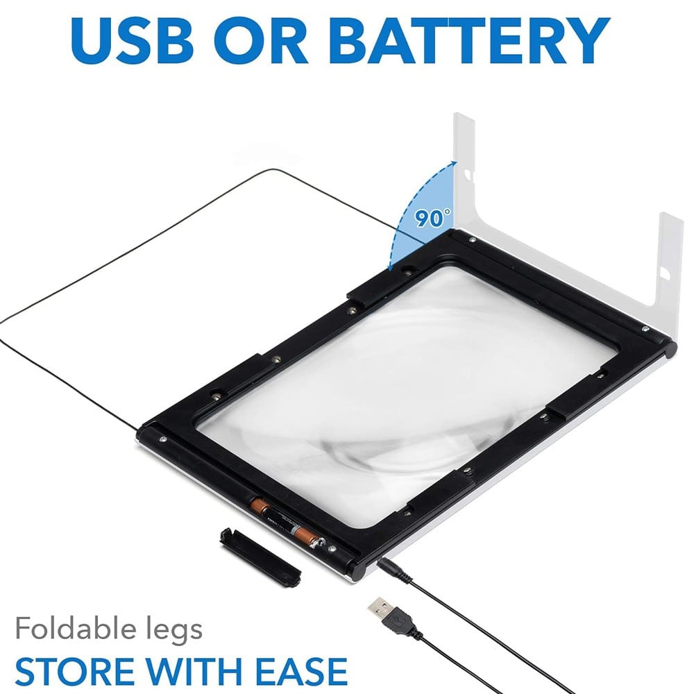 Το τέλειο σχήμα για ανάγνωση:Ο ορθογώνιος μεγεθυντικός φακός 2x είναι σχεδιασμένος σύμφωνα με τον φυσικό τρόπο ανάγνωσης των βιβλίων και όλων των κειμένων. Για βέλτιστη μεγέθυνση, θα πρέπει να χρησιμοποιείτε τον μεγεθυντικό φακό σε απόσταση περίπου 10 cm από το αντικείμενο προς παρατήρηση. Φωτισμός κατά τη μεγέθυνση:Ο μεγεθυντικός φακός είναι εξοπλισμένος με 12 ενεργειακά αποδοτικές λυχνίες LED True-Lux που κατανέμονται γύρω από το μεγεθυντικό πλαίσιο. Τα φώτα παρέχουν μια ομοιόμορφα φωτισμένη περιοχή θέασης, ιδανική για ανάγνωση κατά τη διάρκεια της ημέρας, της νύχτας και σε συνθήκες κακού φωτισμού. Τα φώτα τροφοδοτούνται από το παρεχόμενο καλώδιο USB ή από τρεις μπαταρίες ΑΑΑ και μπορούν να διαρκέσουν για μέρες. Κύρια χαρακτηριστικά:210 mm (L) x 280 mm (W).Φακός Fresnel: Μεγέθυνση 2x.Εστιακό μήκος: 102 mm.12 φώτα LED True-Lux.Πτυσσόμενος βραχίονας.Λουράκι λαιμού.Λειτουργία μέσω USB (περιλαμβάνεται καλώδιο).Λειτουργία με μπαταρία από 3 μπαταρίες AAA (δεν περιλαμβάνονται).