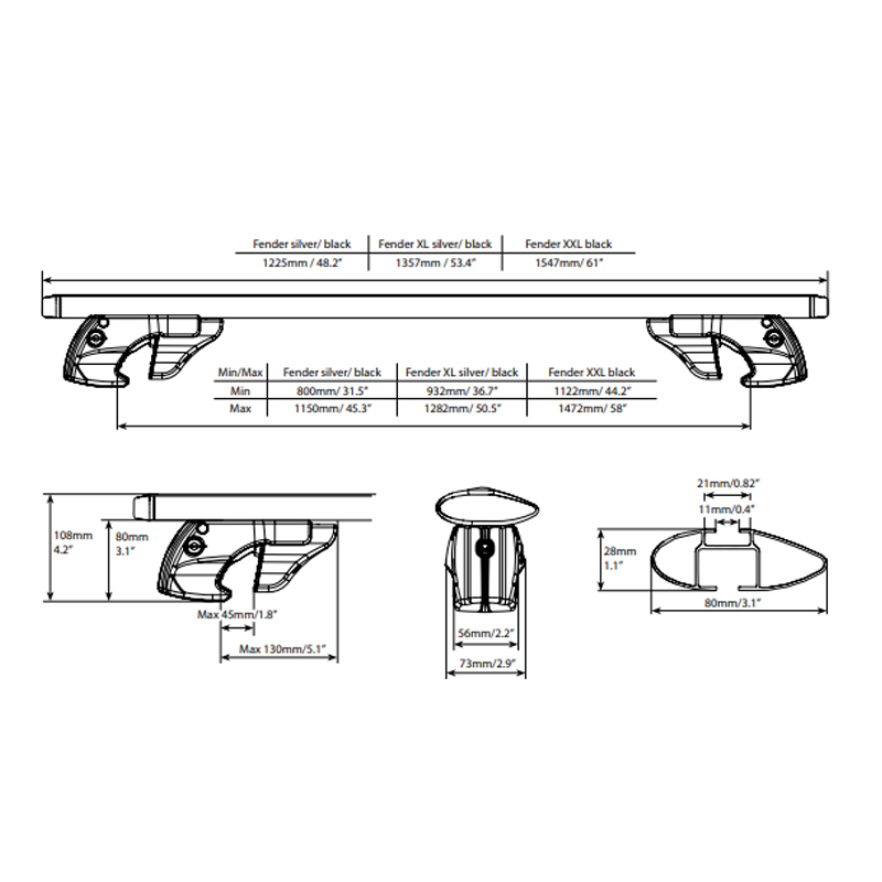 Οι μπάρες οροφής Menabo Fender έχουν σχεδιαστεί σύμφωνα με ευρωπαϊκές προδιαγραφές ποιότητας και ασφάλειας. Εφαρμόζουν σε οχήματα με εργοστασιακές ράγες οροφής τύπου Standard ή Raised Rails. Η σχεδίαση εξασφαλίζει σωστή εφαρμογή και σταθερή στήριξη φορτίου.