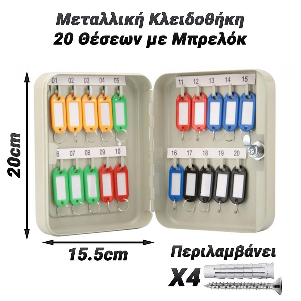 Διατηρήστε τα κλειδιά σας ασφαλή και οργανωμένα με τη Μεταλλική Κλειδοθήκη 20 Θέσεων με Μπρελόκ! Στιβαρή μεταλλική κατασκευή που ασφαλίζει με κλειδαριά (περιλαμβάνει 2 κλειδιά) Με 20 ξεχωριστές θέσεις, μπορείτε να ταξινομήσετε τα κλειδιά σας με βάση τις ανάγκες σας. Περιλαμβάνει 20 μπρελόκ με ετικέτα. Είτε για το σπίτι, το γραφείο ή τον επαγγελματικό σας χώρο, η Μεταλλική Κλειδοθήκη 20 Θέσεων με Μπρελόκ είναι η ιδανική επιλογή για να διατηρήσετε την οργάνωση και την ασφάλεια των κλειδιών σας.