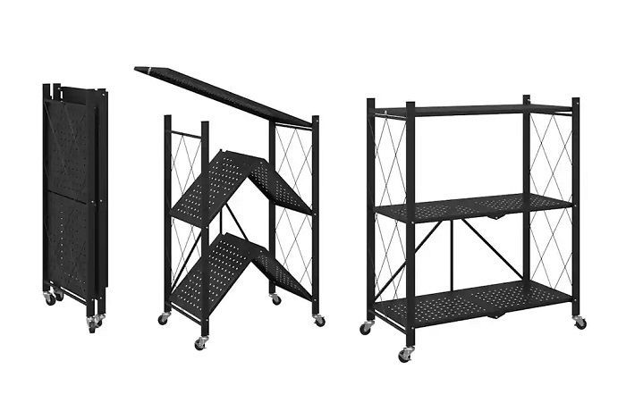 Μεταλλική ραφιέρα 3 επιπέδων, τροχήλατη και πτυσσόμενη για εύκολη αποθήκευση, ιδανική για οργάνωση οικιακών χώρων και αποθήκης.