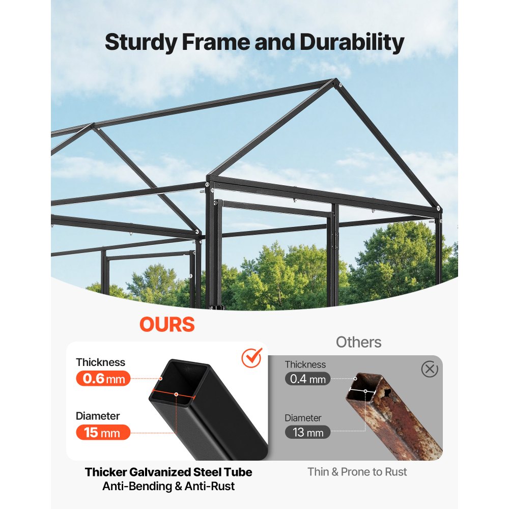 Συμπαγής & Αποδοτικός Χώρος: Αυτό το κοτέτσι 9,8 ποδιών είναι ιδανικό για τη δημιουργία ξεχωριστών τμημάτων ή για τη στέγαση 6-8 κοτόπουλων. Η τριπλή πόρτα επιτρέπει την εύκολη πρόσβαση και κίνηση, ενώ τα ανοιχτά τοιχώματα από πλέγμα προσφέρουν εξαιρετικό αερισμό. Συμβατό με κοτέτσια με κουτί φωλιάς. Ενισχυμένο τετράγωνο πλαίσιο σωλήνα: Κατασκευασμένο από τετράγωνους σωλήνες από ανθρακούχο χάλυβα ανθεκτικούς στη διάβρωση και ασφαλισμένο με πασσάλους εδάφους σε σχήμα U για σταθερότητα. Ο μικρός διάδρομος για κοτόπουλα έχει σχεδιαστεί για να αντέχει σε ισχυρούς ανέμους, έντονο χιόνι και σκληρές καιρικές συνθήκες για μακροχρόνια ανθεκτικότητα. Βελτιωμένο καταφύγιο: Αυτό το κοτέτσι με στέγη σε σχήμα σπείρας, με παχύ εξαγωνικό συρματόπλεγμα που ασφαλίζεται με φερμουάρ, εμποδίζει τα πουλερικά να διαφύγουν. Ο πάτος διαθέτει σπειροειδές σύρμα και ενισχυμένα μάνδαλα πόρτας για να αποτρέπει τα αρπακτικά ζώα, όπως ρακούν και αλεπούδες, που θέλουν να εισβάλουν. Προστασία από παντός καιρού: Αυτό το κλουβί για κοτόπουλα διαθέτει στέγη PE γρήγορης εγκατάστασης που παρέχει σκιά τις ηλιόλουστες μέρες και ένα στεγνό καταφύγιο κατά τη διάρκεια της βροχής. Ο σχεδιασμός με σπείρωμα επιτρέπει στη βροχή και το χιόνι να γλιστρούν φυσικά, αποτρέποντας τη συσσώρευση. Εύκολη συναρμολόγηση: Το εξωτερικό κλουβί για πουλερικά περιλαμβάνει όλα τα απαραίτητα αξεσουάρ—γάντια, πασσάλους εδάφους σε σχήμα U και φερμουάρ. Η συναρμολόγηση από δύο άτομα διαρκεί περίπου 1-2 ώρες.