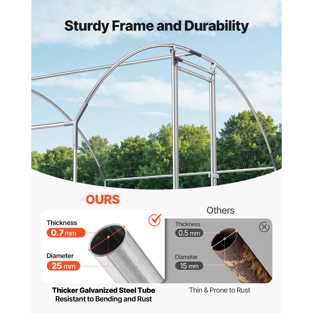 Ανθεκτικό στις καιρικές συνθήκες και στη διάβρωση: Κατασκευασμένο από γαλβανισμένους σωλήνες από χάλυβα και δοκιμασμένο αυστηρά έναντι αλατιού, αυτό το κοτέτσι με διάδρομο αντέχει σε σκληρές καιρικές συνθήκες όπως βροχή, άνεμο και έκθεση στον ήλιο, εξασφαλίζοντας μακροπρόθεσμη σταθερότητα και ασφάλεια. Ανθεκτική δομή: Με γαλβανισμένους σωλήνες από χάλυβα πάχους 2,5 εκ. και ακριβείς συγκολλήσεις, αυτό το μεταλλικό κοτέτσι διαθέτει σταθερότητα και αντοχή στον αέρα. Το επάνω κάλυμμα διευκολύνει την αποτελεσματική αποστράγγιση, αποτρέποντας τη συσσώρευση νερού. Ενισχυμένο με εξαγωνικό προστατευτικό πλέγμα, παρέχει έναν ασφαλέστερο χώρο για τα πουλερικά. Ευρύχωρος χώρος διαβίωσης: Αυτό το κοτέτσι με γενναιόδωρο χώρο 9,8x13,1x6,5 πόδια, διαθέτει τετράπλευρο αερισμό, δημιουργώντας ένα υγιεινό και άνετο περιβάλλον. Το στέγαστρο με επίστρωση PE παρέχει προστασία από τον ήλιο, στεγανοποίηση και αντοχή στο σκίσιμο, προστατεύοντας τα πουλερικά σας από εξωτερικά στοιχεία. Εύκολη εγκατάσταση: Με εύχρηστα αξεσουάρ, η εγκατάσταση είναι παιχνιδάκι. Μπορείτε να ενισχύσετε τους χώρους για κοτέτσια στην αυλή με στέγαστρο προσθέτοντας ξύλο ή πέτρες στο κάτω μέρος. Για πρόσθετη προστασία από άγρια ζώα, όπως τα ρακούν, συνιστούμε την προσθήκη ενός γαλβανισμένου συρματοπλέγματος. Ευέλικτη εφαρμογή: Το μεγάλο κοτέτσι δεν είναι κατάλληλο μόνο για κοτόπουλα αλλά και για πάπιες, ορτύκια, κουνέλια και άλλα πουλερικά. Καλύπτει τις ανάγκες σας, παρέχοντας έναν ασφαλή και άνετο χώρο διαβίωσης για τα πουλερικά.