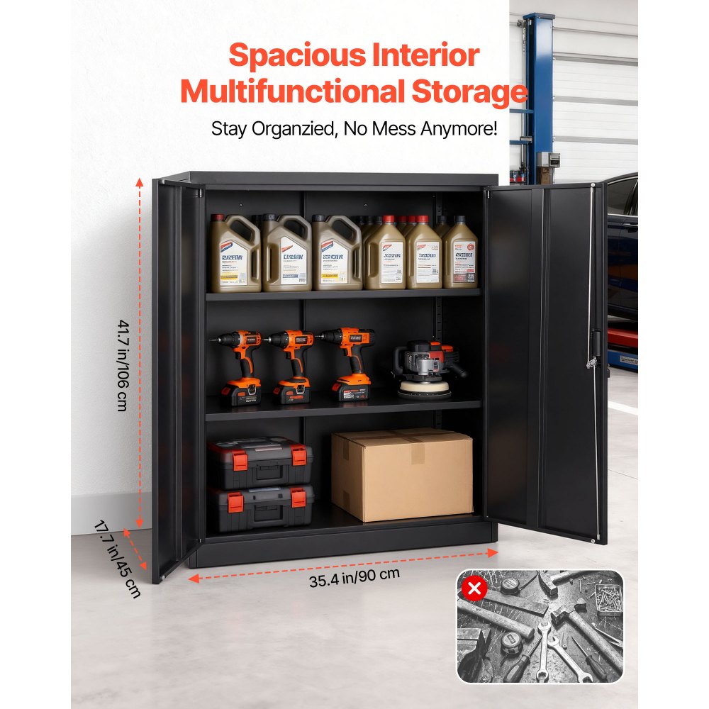 Μεγιστοποίηση χώρου αποθήκευσης: Αυτό το μεταλλικό ντουλάπι διαθέτει 3 ευρύχωρα επίπεδα, με 2 ρυθμιζόμενα και αφαιρούμενα ράφια που χωρούν εύκολα αντικείμενα διαφόρων υψών. Ο ευέλικτος σχεδιασμός του το καθιστά ιδανικό για την οργάνωση αρχείων γραφείου, εργαλείων γκαράζ ή οικιακών ειδών. Ανθεκτικό και στιβαρό: Κατασκευασμένο από χάλυβα βαρέως τύπου, αυτό το μεταλλικό ντουλάπι γκαράζ διαθέτει φινίρισμα ανθεκτικό στη σκουριά, τη διάβρωση και τις γρατσουνιές. Κάθε ράφι αντέχει βάρος έως και 54,4 kg, με συνολική χωρητικότητα 163,3 kg, ιδανικό για την αποθήκευση αρχείων γραφείου και εργαλείων γκαράζ. Ασφαλές και Σταθερό: Μια κλειδαριά τριών σημείων με 2 κλειδιά κρατά τα αντικείμενά σας ασφαλή σε αυτό το ντουλάπι αποθήκευσης γκαράζ. 4 μαγνητικά κουμπώματα κρατούν τις πόρτες ερμητικά κλειστές, ενώ τα ενισχυμένα τριγωνικά στηρίγματα αποτρέπουν την ανατροπή. Ασφάλεια τοποθέτησης σε τοίχο: Το πίσω μέρος αυτού του χαλύβδινου ντουλαπιού αποθήκευσης περιλαμβάνει οπές στερέωσης για ασφαλή τοποθέτηση στον τοίχο. Πάντα να εγκαθιστάτε το κιτ προστασίας από ανατροπή πριν από τη χρήση, ειδικά κοντά σε παιδιά ή σε ανώμαλες επιφάνειες, για επιπλέον σταθερότητα. Εύκολη συναρμολόγηση: Με απλό σχεδιασμό πάνελ, αυτό το μεταλλικό ντουλάπι με κλειδαριά επιτρέπει γρήγορη και εύκολη εγκατάσταση. Οι οδηγίες βήμα προς βήμα σας καθοδηγούν για να το συναρμολογήσετε γρήγορα και να ξεκινήσετε αμέσως την οργάνωση του χώρου αποθήκευσης.