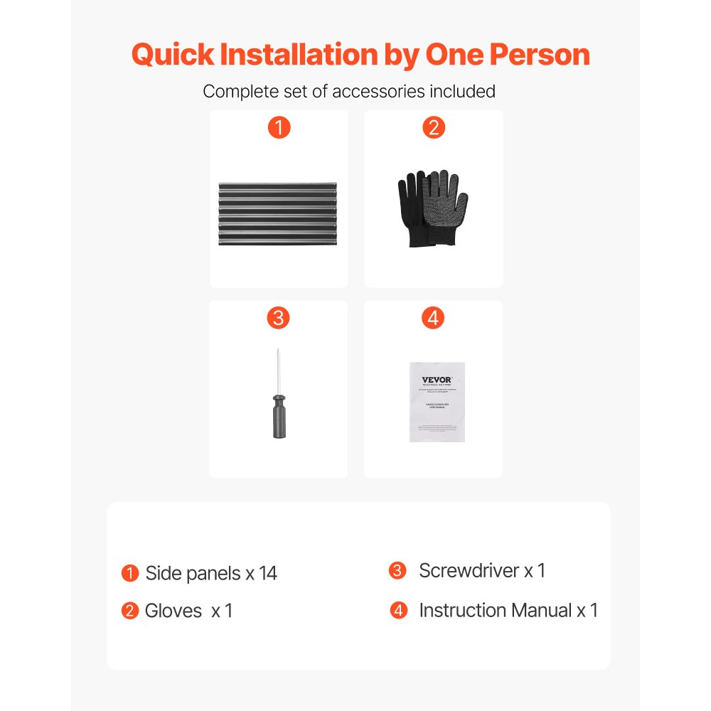 Δημιουργήστε έναν εκπληκτικό κήπο: Το υπερυψωμένο παρτέρι μας 1,8 x 1,8 x 1,4 μ. παρέχει άφθονο χώρο ανάπτυξης για τα φυτά σας. Το βάθος του 1,8 μ. είναι ιδανικό για διάφορα φυτά. Καλλιεργήστε λαχανικά, φρούτα, λουλούδια και βότανα σε κήπους, αγροκτήματα, χωράφια ή ανοιχτούς χώρους. Ανθεκτικό και αξιόπιστο: Κατασκευασμένο από γαλβανισμένα πάνελ 0,4 mm, ανθεκτικά στη σκουριά, αυτό το μεταλλικό υπερυψωμένο παρτέρι κήπου είναι στιβαρό και κατασκευασμένο για να διαρκεί. Σχεδιασμένο για μακροχρόνια χρήση σε εξωτερικούς χώρους, είναι έτοιμο να αντέξει τα στοιχεία της φύσης και να υποστηρίξει την κηπουρική σας όλο το χρόνο. Ασφαλής χρήση: Η υπερυψωμένη γλάστρα μας διαθέτει κυλιόμενες άκρες και στρογγυλεμένες γωνίες για να μειωθεί η πιθανότητα τραυματισμού κατά τη χρήση. Συνοδεύεται επίσης από ένα ζευγάρι γάντια για την ελαχιστοποίηση των γρατζουνιών από τα χέρια, επιτρέποντάς σας να απολαμβάνετε μια ομαλή εμπειρία κηπουρικής. Εύκολη εγκατάσταση: Με ολοκληρωμένες βίδες και προ-τρυπημένο σχεδιασμό, το υπερυψωμένο παρτέρι μπορεί να συναρμολογηθεί εύκολα ακολουθώντας το εγχειρίδιο. Χρειάζονται μόνο 15 λεπτά για να τοποθετηθεί χωρίς να απαιτούνται επιπλέον εργαλεία, καθιστώντας το ιδανικό για λάτρεις της κηπουρικής, ακόμη και για αρχάριους. Τι θα πάρετε: Το υπερυψωμένο παρτέρι μας περιλαμβάνει 14 πάνελ, 1 ζευγάρι γάντια, 1 κατσαβίδι και 1 εγχειρίδιο χρήστη