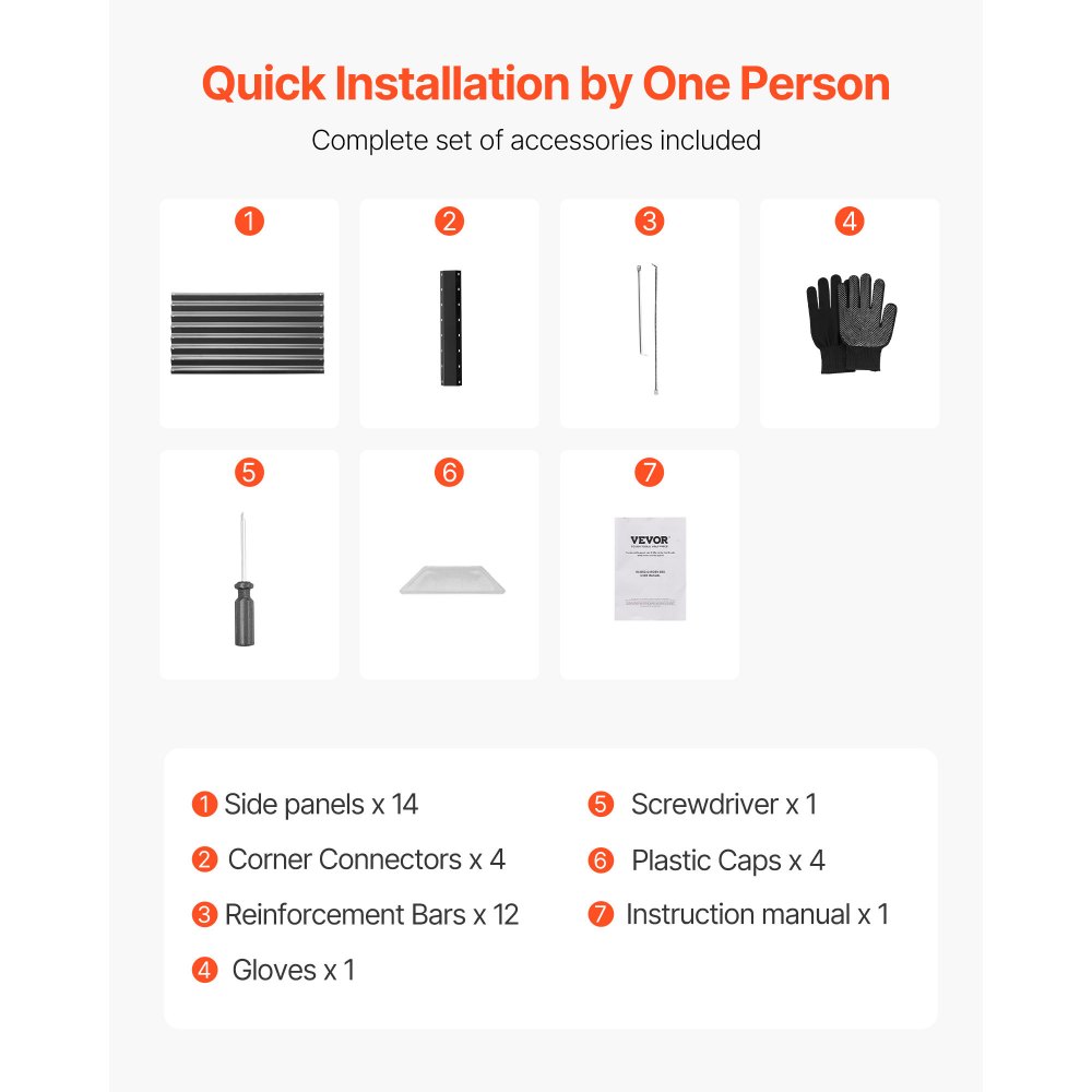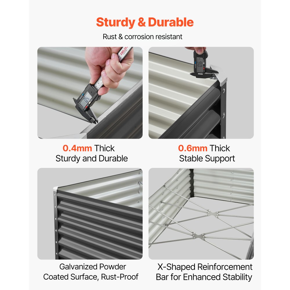 Δημιουργήστε έναν εκπληκτικό κήπο: Το υπερυψωμένο παρτέρι μας 6 x 3 x 1,4 ποδιών παρέχει άφθονο χώρο ανάπτυξης για τα φυτά σας. Το βάθος του 1,4 ποδιών είναι ιδανικό για φυτά μεσαίου και βαθιού ριζώματος. Καλλιεργήστε λαχανικά, φρούτα, λουλούδια και βότανα σε κήπους, αγροκτήματα, χωράφια ή ανοιχτούς χώρους. Ανθεκτικό και αξιόπιστο: Κατασκευασμένο με μεταλλικά πλαϊνά πάνελ 0,4 mm και γωνιακούς συνδέσμους 0,7 mm, αυτό το μεταλλικό υπερυψωμένο παρτέρι διαθέτει γαλβανισμένη επιφάνεια με ηλεκτροστατική βαφή για αντοχή στη σκουριά. Οι 12 εσωτερικές ράβδοι σε σχήμα Χ προσθέτουν σταθερότητα και αποτρέπουν την ανατροπή από τον άνεμο. Ασφαλής χρήση: Η υπερυψωμένη γλάστρα μας διαθέτει κυλιόμενες άκρες και στρογγυλεμένες γωνίες για να μειωθεί η πιθανότητα τραυματισμού κατά τη χρήση. Συνοδεύεται επίσης από ένα ζευγάρι γάντια για την ελαχιστοποίηση των γρατζουνιών από τα χέρια, επιτρέποντάς σας να απολαμβάνετε μια ομαλή εμπειρία κηπουρικής. Εύκολη εγκατάσταση: Με ολοκληρωμένες βίδες και προ-τρυπημένο σχεδιασμό, το υπερυψωμένο παρτέρι μπορεί να συναρμολογηθεί εύκολα ακολουθώντας το εγχειρίδιο. Χρειάζονται μόνο 15 λεπτά για να τοποθετηθεί χωρίς να απαιτούνται επιπλέον εργαλεία, καθιστώντας το ιδανικό για λάτρεις της κηπουρικής, ακόμη και για αρχάριους. Τι θα πάρετε: Το υπερυψωμένο παρτέρι μας περιλαμβάνει 14 πλαϊνά πάνελ, 4 γωνιακά πάνελ, 12 εγκάρσιες ράβδους, 4 πλαστικά καπάκια, 1 σετ εξαρτημάτων και 1 εγχειρίδιο χρήστη