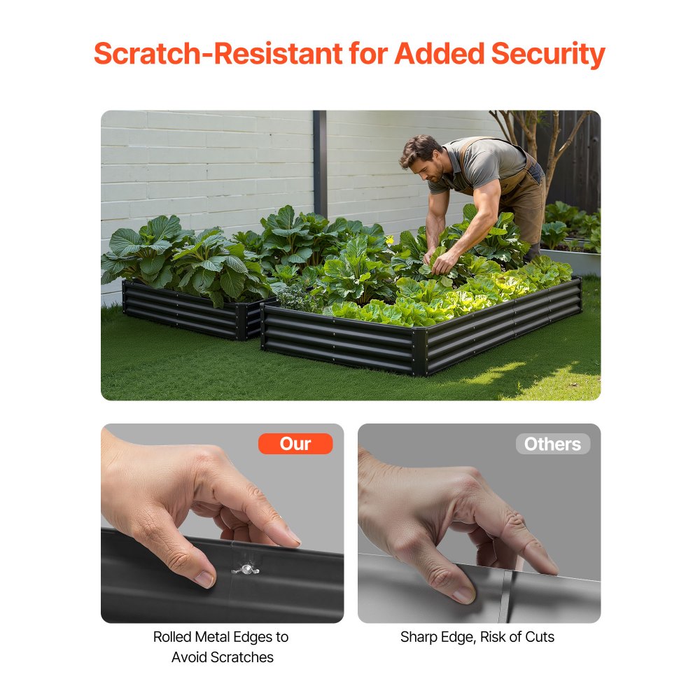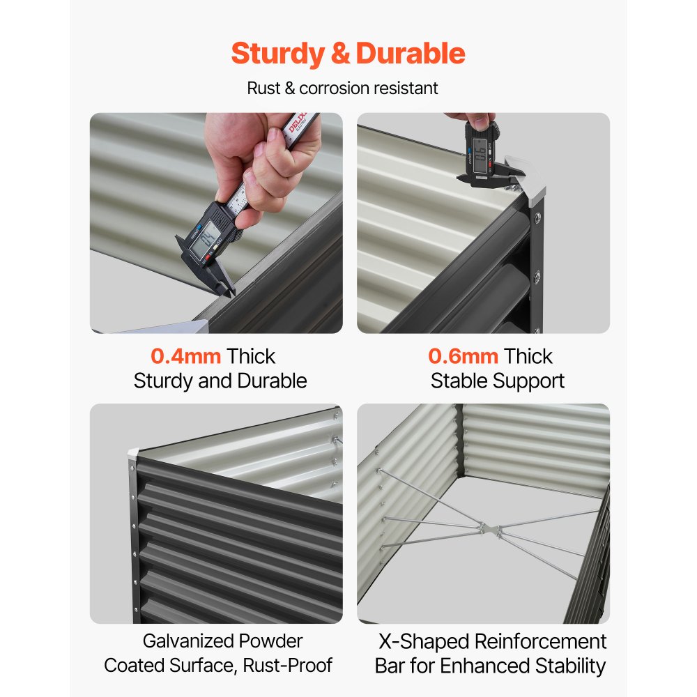 Δημιουργήστε έναν εκπληκτικό κήπο: Το υπερυψωμένο παρτέρι μας 1,8 x 1,8 x 2,8 μέτρα παρέχει άφθονο χώρο ανάπτυξης για τα φυτά σας. Το βάθος του 6 ποδιών είναι ιδανικό για φυτά μεσαίου και βαθιού ριζώματος. Καλλιεργήστε λαχανικά, φρούτα, λουλούδια και βότανα σε κήπους, αγροκτήματα, χωράφια ή ανοιχτούς χώρους. Ανθεκτικό και αξιόπιστο: Κατασκευασμένο με μεταλλικά πλαϊνά πάνελ 0,4 mm και γωνιακούς συνδέσμους 0,6 mm, αυτό το μεταλλικό υπερυψωμένο παρτέρι διαθέτει γαλβανισμένη επιφάνεια με ηλεκτροστατική βαφή για αντοχή στη σκουριά. Οι 6 εσωτερικές ράβδοι σε σχήμα Χ προσθέτουν σταθερότητα και αποτρέπουν την ανατροπή από τον άνεμο. Ασφαλής χρήση: Η υπερυψωμένη γλάστρα μας διαθέτει κυλιόμενες άκρες και στρογγυλεμένες γωνίες για να μειωθεί η πιθανότητα τραυματισμού κατά τη χρήση. Συνοδεύεται επίσης από ένα ζευγάρι γάντια για την ελαχιστοποίηση των γρατζουνιών από τα χέρια, επιτρέποντάς σας να απολαμβάνετε μια ομαλή εμπειρία κηπουρικής. Εύκολη εγκατάσταση: Με ολοκληρωμένες βίδες και προ-τρυπημένο σχεδιασμό, το υπερυψωμένο παρτέρι μπορεί να συναρμολογηθεί εύκολα ακολουθώντας το εγχειρίδιο. Χρειάζονται μόνο 15 λεπτά για να τοποθετηθεί χωρίς να απαιτούνται επιπλέον εργαλεία, καθιστώντας το ιδανικό για λάτρεις της κηπουρικής, ακόμη και για αρχάριους. Τι θα πάρετε: Το υπερυψωμένο παρτέρι μας περιλαμβάνει 6 πλαϊνά πάνελ, 4 γωνιακά πάνελ, 6 εγκάρσιες ράβδους, 4 πλαστικά καπάκια, 1 σετ εξαρτημάτων και 1 εγχειρίδιο χρήστη