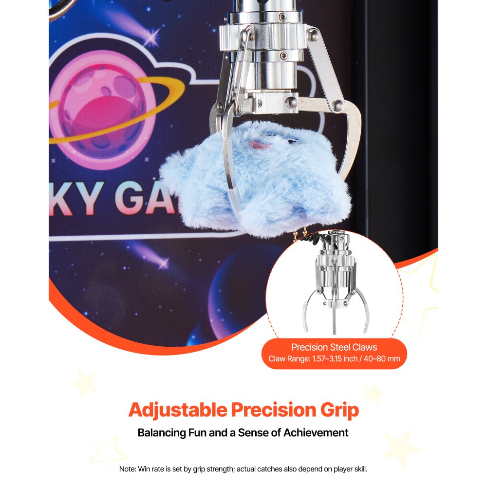 Ρυθμιζόμενη ατσάλινη δαγκάνα: Αυτή η μηχανή γερανού με δαγκάνα διαθέτει ισχυρή ατσάλινη δαγκάνα με ρυθμιζόμενη λαβή για παιχνίδια 1,57-3,15 ίντσες/40-80 mm. Απολαύστε ακριβείς λαβές και διασκέδαση arcade, όπου η επιτυχία εξαρτάται τόσο από τη δύναμη όσο και από την ικανότητα της δαγκάνας. Σόου με Φως και Ήχο: Αυτή η μηχανή με γερανό με νύχια προσφέρει μια καθηλωτική ατμόσφαιρα arcade με πολύχρωμα φώτα και κλασικούς ήχους. Η ρυθμιζόμενη ένταση ήχου και ο κινητήρας 60W εξασφαλίζουν ομαλή, ενεργειακά αποδοτική λειτουργία και ασταμάτητη ψυχαγωγία στο σπίτι. Απλό Παιχνίδι: Εύκολο στη λειτουργία—εισάγετε 1–15 κέρματα για να ξεκινήσετε. Το μηχάνημα γερανού περιλαμβάνει 50 κέρματα, διαθέτει ευαίσθητο joystick και ευκρινή οθόνη, και προσφέρει ομαλό έλεγχο για παίκτες όλων των ηλικιών. Ανθεκτική και κομψή κατασκευή: Κατασκευασμένη με σώμα από ανθρακούχο χάλυβα και διαφανές ακρυλικό παράθυρο, αυτή η επαγγελματική μηχανή με νύχια είναι μακράς διαρκείας και οπτικά ελκυστική - ιδανική για αίθουσες παιχνιδιών στο σπίτι, στοές, κινηματογράφους και πάρτι. Εύκολη συντήρηση: Διαθέτει δύο κλειδιά για εύκολη πρόσβαση σε κέρματα και εσωτερικά μέρη. Αυτή η μηχανή με νύχια εξασφαλίζει αξιόπιστη λειτουργία και μακροχρόνια διασκέδαση για οικιακή ή επαγγελματική χρήση.