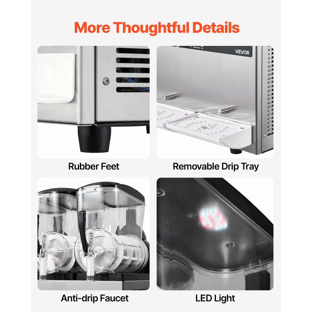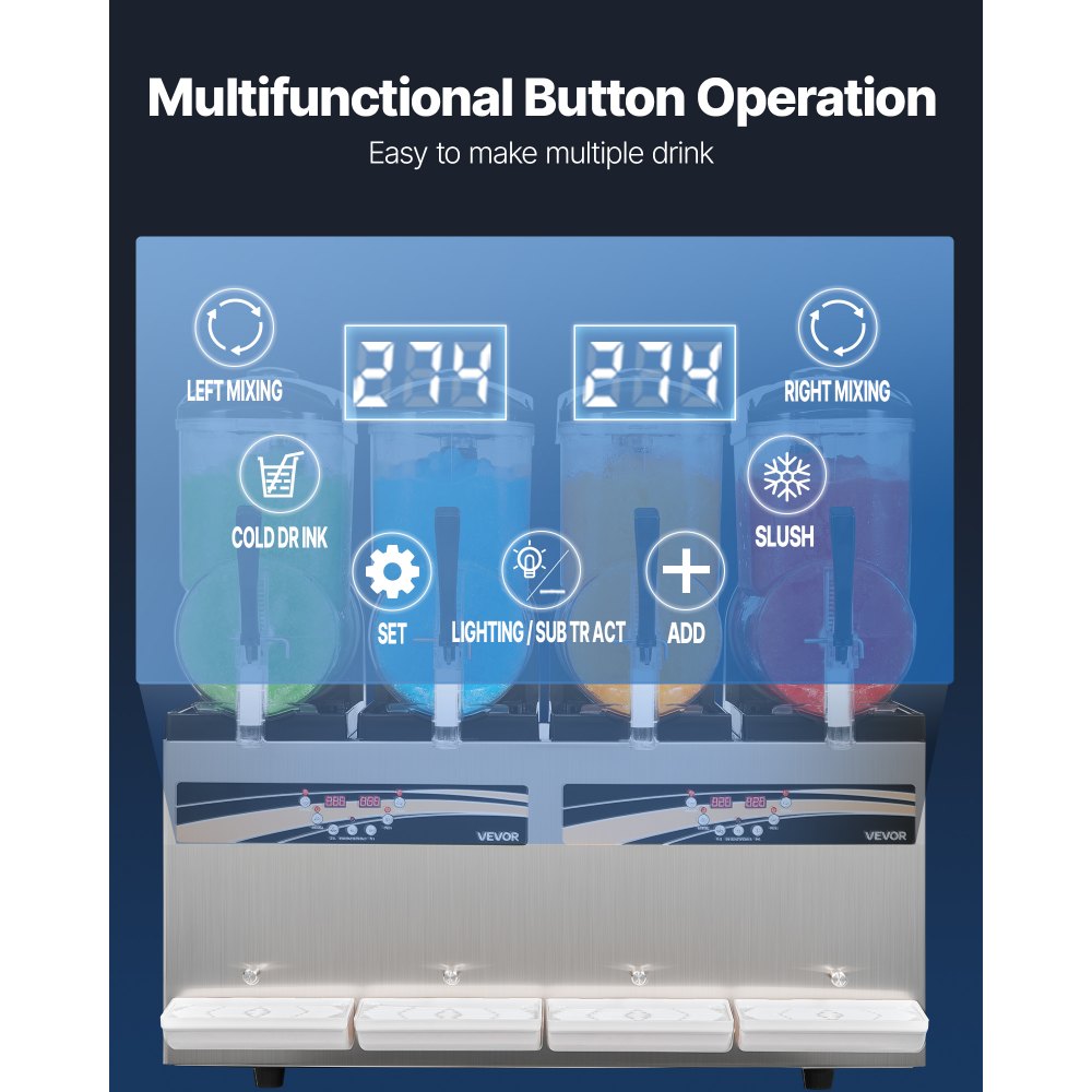 Για Διάφορα Ποτά: Αυτή η αναβαθμισμένη επαγγελματική μηχανή παρασκευής ζαχαρούχων ποτών διαθέτει ρυθμιζόμενο εύρος θερμοκρασίας από 5 έως 50℉ / -15 έως 10℃, επιτρέποντάς σας να ελέγχετε την απαλότητα ή τη σκληρότητα των ποτών σας. Για κρύο ποτό: 3 έως 5℃/37,4 έως 41℉· για μη αλκοολούχο ζαχαρούχο ποτό: -3 έως -1℃/26,6 έως 30,2℉· για αλκοολούχα ποτά: -15C έως -6C/5F έως 21,2℉. (Συνιστώμενη περιεκτικότητα σε ζάχαρη: περίπου 13%, περιεκτικότητα σε αλκοόλ: κάτω από 13%). Είναι ιδανική για την παρασκευή ποικιλίας ποτών όπως χυμούς, τσάι, μαργαρίτα και παγωμένο καφέ. 4 Ανεξάρτητες Ρυθμίσεις Δεξαμενών: Με τέσσερις δεξαμενές χωρητικότητας 12L / 3,17 GAL, αυτή η μηχανή για γλυκά μπορεί να φτιάξει περίπου 192 φλιτζάνια γλυκά ποτά ανά παρτίδα, μπορείτε να επιλέξετε να χρησιμοποιείτε κάθε δεξαμενή ανεξάρτητα. Απαιτεί λιγότερο συχνό ξαναγέμισμα, καθιστώντας την ιδανική για εμπορική χρήση με μεγάλη κίνηση. Η διαφανής δεξαμενή αναδεικνύει όμορφα τα πολύχρωμα ποτά, καθιστώντας την ιδανική για καταστήματα παγωτού, μπεργκεράδικα, καφετέριες, μπαρ και άλλους εμπορικούς χώρους. Εύκολη λειτουργία: Ο εύχρηστος πίνακας ελέγχου επιτρέπει την εύκολη λειτουργία, συμπεριλαμβανομένων δύο ρυθμίσεων λειτουργίας (γλυκό και κρύο ρόφημα), αυτόματου καθαρισμού, ελέγχου θερμοκρασίας και ρυθμίσεων ώρας. Η θερμοκρασία εμφανίζεται ευκρινώς στην ψηφιακή οθόνη, διευκολύνοντας την παρακολούθηση ανά πάσα στιγμή. Ανθεκτικό & Εύκολο στον καθαρισμό: Κατασκευασμένο από σώμα από ανοξείδωτο ατσάλι και δεξαμενή PC κατάλληλη για τρόφιμα, αυτή η επαγγελματική μηχανή slushie είναι κατασκευασμένη για να διαρκεί και εύκολη στον καθαρισμό. Η δεξαμενή διαθέτει αυτόματο καθαρισμό με ένα κουμπί και τα αρθρωτά εξαρτήματα μπορούν εύκολα να αποσυναρμολογηθούν χωρίς εργαλεία για εύκολη συντήρηση και καθαρισμό. Πρόσθετα χαρακτηριστικά: Η μηχανή παρασκευής λάσπης είναι εξοπλισμένη με τέσσερις δίσκους συλλογής υγρών στο κάτω μέρος για την αποφυγή διαρροών νερού, οι οποίοι μπορούν να αφαιρεθούν για εύκολο καθάρισμα. Η βρύση με ελατήριο εξασφαλίζει ελάχιστη διαρροή νερού μετά τη χρήση. Ο σχεδιασμός εξαερισμού τριών πλευρών βοηθά στην γρήγορη απαγωγή της θερμότητας και τα ελαστικά πόδια παρέχουν αντιολισθητική σταθερότητα κατά τη λειτουργία, εξασφαλίζοντας καλύτερη σταθερότητα της μηχανής.