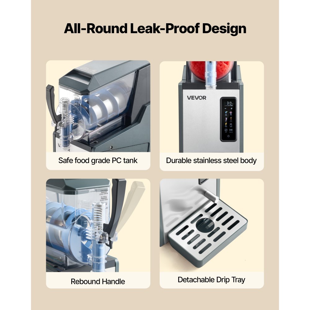 5 προκαθορισμένα προγράμματα: Με 5 προκαθορισμένα προγράμματα, αυτή η μηχανή παρασκευής γλυκών παρασκευάζει γλυκά milkshake, γλυκά με αλκοόλ, κοκτέιλ, γλυκά καφέ και καθημερινά κρύα ποτά. Δεν χρειάζεται πάγος ή προψύξη. Η ζάχαρη πρέπει να είναι ≥6%, το αλκοόλ 6%-16% και δεν επιτρέπονται γλυκά χωρίς ζάχαρη. Γρήγορη ψύξη: Με ισχυρό συμπιεστή, η μηχανή ψύχει γρήγορα τα ποτά, ενώ οι λεπίδες που περιστρέφονται 360° εξασφαλίζουν ομοιόμορφη ψύξη και λεία υφή. Ο χρόνος ψύξης εξαρτάται από τη θερμοκρασία περιβάλλοντος, διαρκεί μόνο 20–65 λεπτά και η λειτουργία με ένα κουμπί σάς επιτρέπει να σερβίρετε, να επιλέξετε ένα πρόγραμμα και να απολαύσετε. Μεγάλη χωρητικότητα: Αυτή η μηχανή slush χειρίζεται αλκοολούχα και μη αλκοολούχα ποτά, από μαργαρίτες μέχρι κατεψυγμένα φρούτα και μιλκσέικ. Προσφέρει 12ωρη μόνωση και οδηγό συνταγών. Ο κουβάς χωράει 4 λίτρα (135 oz), με συνιστώμενη μέγιστη πλήρωση 3,5 λίτρα (118 oz). Εύκολος καθαρισμός: Για συντήρηση, η μηχανή παρασκευής λασπωτήρα προσφέρει λειτουργία αυτοκαθαρισμού. Για βαθύτερο καθαρισμό, ξεκλειδώστε την πίσω λαβή, αφαιρέστε τη δεξαμενή και τα εξαρτήματα και, στη συνέχεια, ξεπλύνετε τα ή τοποθετήστε τα στο πλυντήριο πιάτων. Ένας αφαιρούμενος δίσκος συλλογής υγρών στο κάτω μέρος απλοποιεί περαιτέρω τον καθαρισμό και διατηρεί τον πάγκο τακτοποιημένο. Απλή λειτουργία: Η λειτουργία αυτής της μηχανής παγωμένων ποτών είναι εύκολη: απλώς ρίξτε το υγρό και επιλέξτε ένα πρόγραμμα για να απολαύσετε. Πέντε επίπεδα υφής σάς επιτρέπουν να επιλέξετε πιο παχύρρευστα ή ελαφρύτερα ποτά, ενώ η εργονομική λαβή παρέχει άνετο έλεγχο, κάνοντας το γέμισμα και τη διανομή ομαλό και αβίαστο.