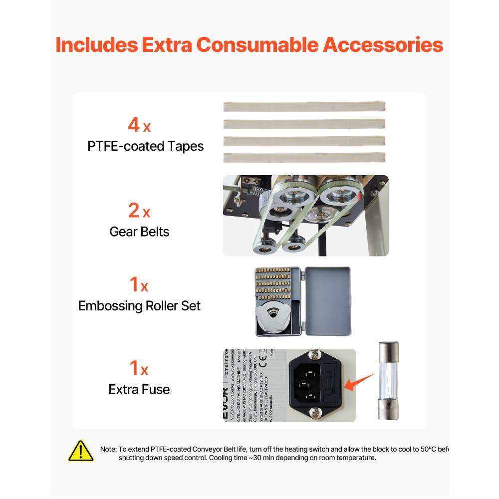 Γρήγορη Σφράγιση: Η μηχανή συνεχούς σφράγισης διαθέτει ισχύ με τον κινητήρα 600W, φτάνοντας ταχύτητες έως και 52,5 ft/min. Προσφέρει σταθερή απόδοση και κάνει τη συσκευασία πιο γρήγορη για διαφορετικές ανάγκες παραγωγής. Ταιριάζει σε πολλούς τύπους σακουλών: Το πλάτος σφράγισης ρυθμίζεται από 0,24–0,47 ίντσες, προσφέροντας ευελιξία για μικρές ή μεγάλες σακούλες. Η μηχανή συνεχούς σφράγισης με ταινία σάς βοηθά να χειρίζεστε ποικίλες συσκευασίες με ευκολία και ενισχύει την αποδοτικότητα στη γραμμή παραγωγής σας. Ευέλικτες λειτουργίες: Η μηχανή σφράγισης ταινιών προσθέτει εκτύπωση εναλλάσσοντας τους τροχούς τύπου, διευκολύνοντας την επισήμανση ημερομηνιών, παρτίδων ή προδιαγραφών κατά τη σφράγιση. Ένας ενσωματωμένος μετρητής παρακολουθεί την ποσότητα της σακούλας σε πραγματικό χρόνο για ομαλό προγραμματισμό. Πλήρη αξεσουάρ: Η μηχανή θερμικής σφράγισης διαθέτει ιμάντα γραναζιών, μεταφορικό ιμάντα με επικάλυψη PTFE, ασφάλεια και σετ τροχών ανάγλυφης εκτύπωσης. Αυτά τα πρόσθετα μειώνουν τον χρόνο διακοπής λειτουργίας, υποστηρίζουν τη μακροχρόνια χρήση και βοηθούν στη διατήρηση της λειτουργίας της γραμμής παραγωγής σας χωρίς προβλήματα. Εύκολη λειτουργία: Ρυθμίστε τη θερμοκρασία από 32–572℉ με έναν γρήγορο πίνακα για απλή εγκατάσταση. Το συνεχές στεγανοποιητικό ταινίας λειτουργεί εξαιρετικά για αποθήκες, καταστήματα, μικρά εργαστήρια, καταστήματα υλικού ή αρτοποιεία, προσφέροντας ευέλικτη σφράγιση.