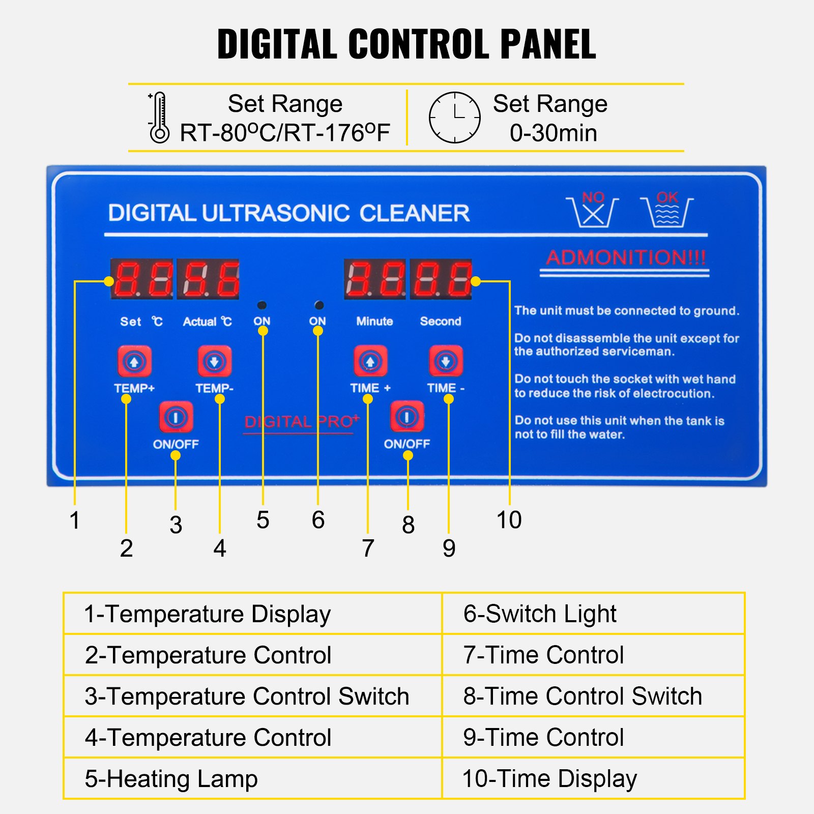 【ΨΗΦΙΑΚΟΣ ΠΙΝΑΚΑΣ ΕΛΕΓΧΟΥ】 - Η μηχανή υπερήχων καθαρισμού κοσμημάτων διαθέτει ψηφιακό πίνακα ελέγχου, με ρυθμιζόμενο χρονόμετρο (0-30 λεπτά) και θερμαντήρα (RT-176℉/RT-80℃) που εμφανίζεται σε LED. Μια λειτουργία θέρμανσης μπορεί να μαλακώσει και να διαλύσει αποτελεσματικά τους λεκέδες από λάδι και κερί, βελτιώνοντας έτσι το αποτέλεσμα καθαρισμού.