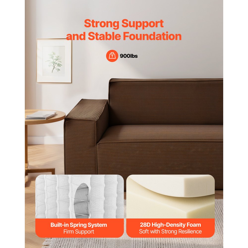 Εξαιρετικά Μακρύ Καθιστικό: Αυτός ο εξαιρετικά μακρύς υφασμάτινος καναπές 83 ιντσών / 2110 χιλιοστών φιλοξενεί εύκολα 4 άτομα χωρίς να νιώθετε ότι υπάρχει συνωστισμός. Είτε πρόκειται για οικογενειακές συγκεντρώσεις είτε για επισκέψεις φίλων, παρέχει έναν άνετο και ευρύχωρο χώρο χαλάρωσης. Άνετα καθίσματα: Ο καναπές-κρεβάτι διαθέτει ενσωματωμένο σύστημα ελατηρίων για σταθερή στήριξη, σε συνδυασμό με αφρό υψηλής πυκνότητας 28D για απαλότητα και εξαιρετική επαναφορά. Αυτός ο συνδυασμός κατανέμει αποτελεσματικά την πίεση του σώματος, εξασφαλίζοντας μια μακράς διαρκείας και άνετη εμπειρία. Ύφασμα από κορδόνι: Κατασκευασμένος από ύφασμα από κορδόνι υψηλής ποιότητας, αυτός ο καναπές είναι απαλός και απαλό στην αφή, ενώ παραμένει αναπνεύσιμος και φιλικός προς το δέρμα. Το ύφασμα δεν είναι μόνο ανθεκτικό στο ξεφλούδισμα, αλλά είναι επίσης εύκολο στο καθάρισμα και τη συντήρηση. Φαρδιά μπράτσα: Τα εξαιρετικά φαρδιά μπράτσα 254 mm παρέχουν άνετη στήριξη στα χέρια σας και μπορούν επίσης να λειτουργήσουν ως μια βολική επιφάνεια για να κρατάτε το τηλέφωνο, τα βιβλία ή μικρά αντικείμενα. Δεν Απαιτείται Συναρμολόγηση: Με τον σχεδιασμό συσκευασίας σε κουτί, αυτός ο καναπές είναι εύκολος στο χειρισμό και τη μεταφορά, απαιτώντας μόνο δύο άτομα για τη μετακίνηση. Αποσυσκευάστε τον καναπέ και αφήστε τον να ξεκουραστεί για 48-72 ώρες και θα επιστρέψει στο αρχικό του σχήμα χωρίς να χρειάζεται περίπλοκη συναρμολόγηση.