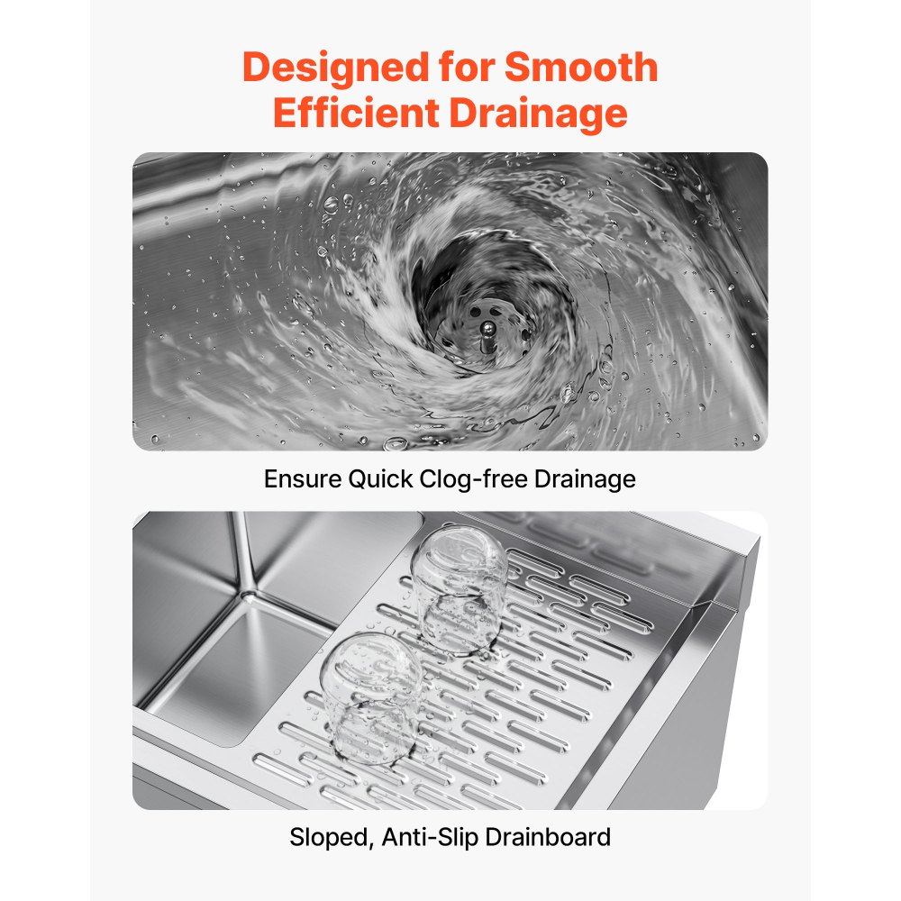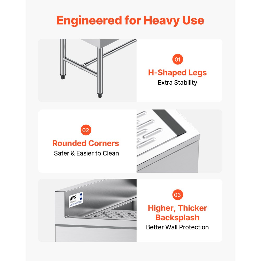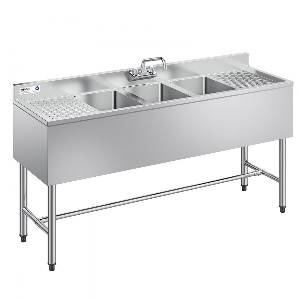 Ανοξείδωτο ατσάλι βαρέως τύπου 18 Gauge: Κατασκευασμένο από παχύ ανοξείδωτο ατσάλι SUS304, αυτός ο νεροχύτης 3 θέσεων παρέχει εξαιρετική αντοχή στη σκουριά και τη διάβρωση. Είναι η ιδανική επιλογή για πολυάσχολη χρήση κάτω από το μπαρ ή για άλλη επαγγελματική χρήση στην κουζίνα. Τριπλός Νεροχύτης με Διπλές Σανίδες Αποστράγγισης: Ο επαγγελματικός μας νεροχύτης 3 τμημάτων διαθέτει τρεις ξεχωριστές γούρνες, διαστάσεων 25 εκ. x 25 εκ. x 25 εκ. η καθεμία, με δύο σανίδες αποστράγγισης 13 εκ. και στις δύο πλευρές. Οι απαλές, στρογγυλεμένες γωνίες εξασφαλίζουν εύκολο καθάρισμα και αποτελεσματική ροή εργασίας. Υψηλή προστασία από πιτσιλιές στο πίσω μέρος: Σχεδιασμένος για επαγγελματικά περιβάλλοντα, αυτός ο επαγγελματικός νεροχύτης 3 θέσεων περιλαμβάνει ένα πίσω μέρος ύψους 3". Βοηθά στην αποτροπή των πιτσιλιών, διατηρεί τους τοίχους καθαρούς και μειώνει τον χρόνο καθαρισμού σε πολυάσχολες κουζίνες. Συμπεριλαμβανόμενη επαγγελματική έξοδος νερού: Ο νεροχύτης τριών διαμερισμάτων περιλαμβάνει μια περιστρεφόμενη έξοδο νερού BXF-W10 από ορείχαλκο χαμηλής περιεκτικότητας σε μόλυβδο με απόσταση 4" στο κέντρο. Η ρυθμιζόμενη παροχή ζεστού και κρύου νερού και ένα περιστρεφόμενο στόμιο 10" παρέχουν ομαλή και ευέλικτη λειτουργία για πολυσύχναστα μπαρ ή κουζίνες. Ενισχυμένη Στήριξη Πλαισίου H: Κατασκευασμένος για σταθερότητα, ο νεροχύτης 3 θέσεων υποστηρίζεται από μια ενισχυμένη δομή πλαισίου H που χειρίζεται βαριά φορτία με σιγουριά. Εξασφαλίζει αξιόπιστη απόδοση κατά τη διάρκεια εργασιών καθαρισμού μεγάλου όγκου.