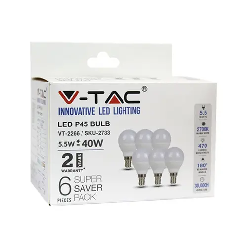 Διατίθεται σε πρακτική συσκευασία Box 6 τεμαχίων, επιτρέποντάς σας να εξοπλίσετε πολλαπλά φωτιστικά σώματα με μία μόνο αγορά. Η κλασική βάση E14 καθιστά την εγκατάσταση απλή και γρήγορη σε ένα πλήθος οικιακών συσκευών και φωτιστικών. Η V-TAC προσφέρει 2 χρόνια εγγύηση, διασφαλίζοντας την αξιοπιστία και την ποιότητα του προϊόντος για καθημερινή χρήση σε κάθε εσωτερικό χώρο (IP20).
