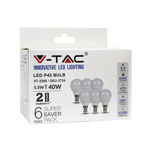 Ο λαμπτήρας LED της V-TAC σε σχήμα P45 αποτελεί μια αξιόπιστη και αποδοτική λύση για τον καθημερινό φωτισμό του σπιτιού ή του γραφείου σας. Με ισχύ 5,5W και φωτεινή ροή 470 lm, αντικαθιστά επάξια έναν παραδοσιακό λαμπτήρα πυρακτώσεως 40W. Η Θερμοκρασία Χρώματος: 4000K (Φυσικό Λευκό) προσφέρει ένα καθαρό και ισορροπημένο φως, καθιστώντας τον ιδανικό για χώρους εργασίας, κουζίνες, μπάνια και κάθε σημείο που απαιτεί διαύγεια χωρίς να κουράζει τα μάτια.