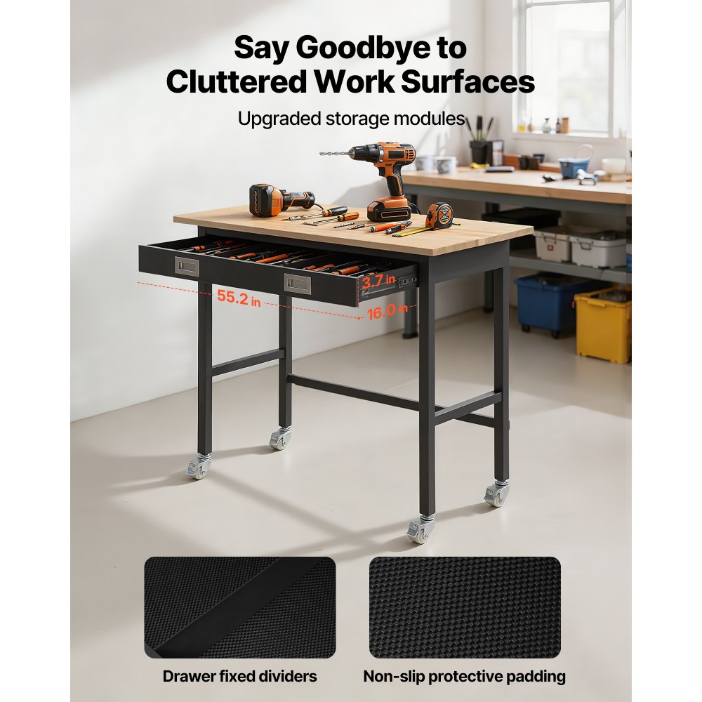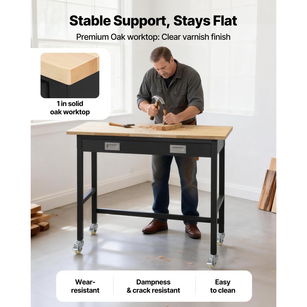 Εξαιρετικά ισχυρό φορτίο 1500 λίβρες: Αυτός ο πάγκος εργασίας 48 x 24 ιντσών αντέχει έως και 1500 λίβρες (680 κιλά), ιδανικός για βαριές εργασίες όπως σκάλισμα, συγκόλληση ή κοπή. Με 4 κλειδώσιμα ροδάκια, είναι εύκολο να μετακινηθεί και να κλειδωθεί με ασφάλεια όπου το χρειάζεστε. Ενσωματωμένη αποθήκευση: Ξεφορτωθείτε την ακαταστασία με στυλ! Αυτός ο πάγκος εργαστηρίου διαθέτει ένα φαρδύ συρτάρι με 3 σταθερά τμήματα για εργαλεία. Τα πλαϊνά άγκιστρα για τα απαραίτητα εργαλεία σας διατηρούν τα πάντα τακτοποιημένα, εξοικονομώντας σας χρόνο και ενισχύοντας την αποδοτικότητά σας. Επιφάνεια από δρυ Premium: Αυτός ο πάγκος εργασίας γκαράζ διαθέτει μια στιβαρή επιφάνεια από δρυ πάχους 2,5 εκατοστών, η οποία είναι ανθεκτική, ανθεκτική στη φθορά και κατασκευασμένη για να διαρκεί. Βερνικωμένη για να αντέχει στην υγρασία και τους λεκέδες, καθαρίζεται εύκολα - απλώς σκουπίστε την με ένα υγρό πανί και είναι σαν καινούρια. Ανθεκτική δομή, κατασκευασμένη για να αντέχει: Κατασκευασμένη από χάλυβα υψηλής ποιότητας, το πλαίσιο πάχους 1 mm παρέχει απαράμιλλη σταθερότητα και ανθεκτικότητα. Με επίστρωση για αντοχή στη διάβρωση και τη σκουριά, αυτός ο πάγκος εργασίας από σκληρό ξύλο έχει σχεδιαστεί για να διαρκεί για χρόνια, υποστηρίζοντας εύκολα τις πιο δύσκολες εργασίες σας. Ευέλικτη χρήση: Ιδανικό για κάθε χώρο—εργαστήριο, γκαράζ, γραφείο ή κουζίνα! Είτε αποθηκεύετε βαριά αντικείμενα είτε εργάζεστε σε δύσκολα έργα, αυτός ο πολυλειτουργικός πάγκος εργασίας προσφέρει αξιόπιστη και στιβαρή στήριξη όπου κι αν τη χρειάζεστε.