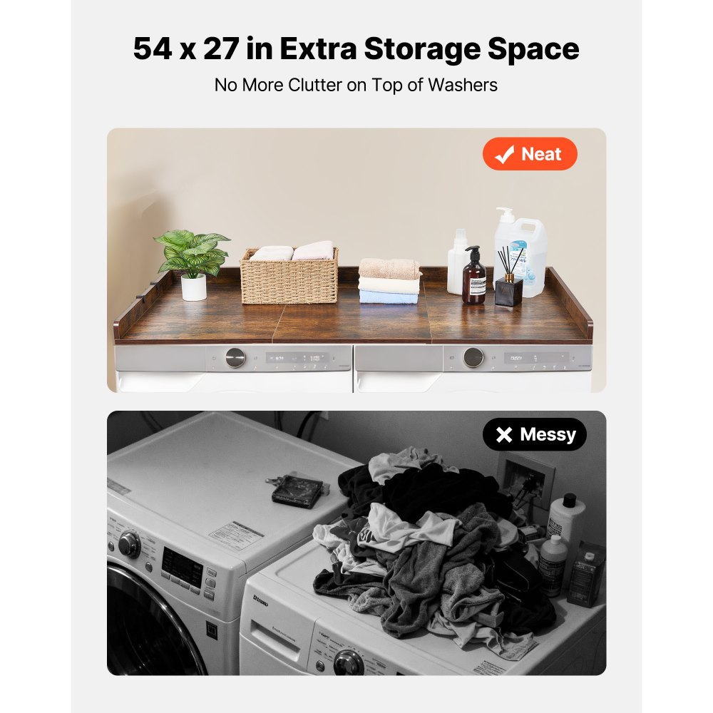 Πολυλειτουργική αποθήκευση: Αυτός ο πάγκος πλυντηρίου-στεγνωτηρίου προσθέτει επιπλέον χώρο στην κορυφή για απορρυπαντικό και άλλα είδη πλυντηρίου, παρέχει μια επιφάνεια για δίπλωμα και σιδέρωμα και περιλαμβάνει πλαϊνά γάντζους για πανιά καθαρισμού και μικρά αντικείμενα. Σταθερή στήριξη: Ο πάγκος του πλυντηρίου και του στεγνωτηρίου μας έχει διαστάσεις 53,9 x 27,5 ίντσες/137 x 69,9 εκ. για να ταιριάζει στα περισσότερα πλυντήρια και να παρέχει χώρο για πλύσιμο, ενώ η υπερυψωμένη άκρη βοηθά στην αποφυγή πτώσης των αντικειμένων. Αξιόπιστη κατασκευή: Κατασκευασμένο από μοριοσανίδα ποιότητας P2, εύκολο στο σκούπισμα, αντέχει βάρος έως και 113 κιλά για την αποθήκευση ρούχων και την καθημερινή χρήση. Εύκολη συναρμολόγηση: Περιλαμβάνει οδηγίες και αξεσουάρ, ρύθμιση ταχύτητας με προ-τρυπημένες τρύπες και οκτώ μαξιλαράκια λαβής στο κάτω μέρος που βοηθούν στην αποφυγή γρατσουνιών στο πάνω μέρος του πλυντηρίου ρούχων και περιορίζουν την μετατόπιση κατά τη λειτουργία. Ευέλικτη χρήση: Χρησιμοποιήστε το κάλυμμα πλυντηρίου και στεγνωτηρίου στο δωμάτιο πλυντηρίων, στο μπάνιο, στην κουζίνα ή στο μπαλκόνι, η καθαρή, μοντέρνα εμφάνιση ταιριάζει σε πολλά στυλ διακόσμησης, η λεία επιφάνεια υποστηρίζει τις καθημερινές εργασίες πλυσίματος και τις αναβαθμίσεις χώρου.