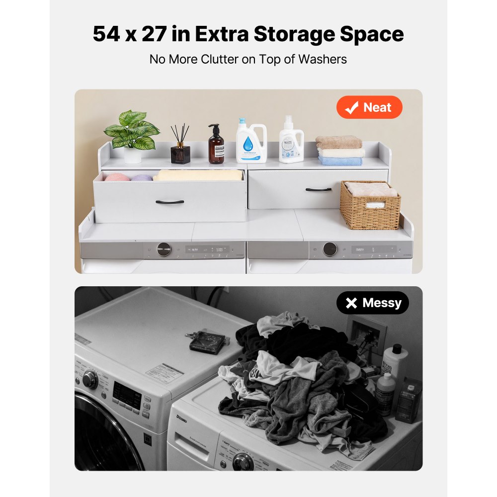 Πολυλειτουργική αποθήκευση: Αυτός ο πάγκος πλυντηρίου-στεγνωτηρίου με δύο μεγάλα συρτάρια, ένα ράφι, πλαϊνά άγκιστρα και μια φαρδιά επιφάνεια για απορρυπαντικό, πετσέτες, κλιπ, δίπλωμα και σιδέρωμα. Σταθερή στήριξη: Ο πάγκος του πλυντηρίου και του στεγνωτηρίου μας έχει διαστάσεις 53,9 x 27,5 ίντσες/137 x 69,9 εκ. για να ταιριάζει στα περισσότερα πλυντήρια και να παρέχει χώρο για πλύσιμο, ενώ η υπερυψωμένη άκρη βοηθά στην αποφυγή πτώσης των αντικειμένων. Αξιόπιστη κατασκευή: Κατασκευασμένο από μοριοσανίδα ποιότητας P2, εύκολο στο σκούπισμα, αντέχει βάρος έως και 113 κιλά για την αποθήκευση ρούχων και την καθημερινή χρήση. Εύκολη συναρμολόγηση: Περιλαμβάνει οδηγίες και αξεσουάρ, ρύθμιση ταχύτητας με προ-τρυπημένες τρύπες και οκτώ μαξιλαράκια λαβής στο κάτω μέρος που βοηθούν στην αποφυγή γρατσουνιών στο πάνω μέρος του πλυντηρίου ρούχων και περιορίζουν την μετατόπιση κατά τη λειτουργία. Ευέλικτη χρήση: Χρησιμοποιήστε το κάλυμμα πλυντηρίου και στεγνωτηρίου στο δωμάτιο πλυντηρίων, στο μπάνιο, στην κουζίνα ή στο μπαλκόνι, η καθαρή, μοντέρνα εμφάνιση ταιριάζει σε πολλά στυλ διακόσμησης, η λεία επιφάνεια υποστηρίζει τις καθημερινές εργασίες πλυσίματος και τις αναβαθμίσεις χώρου.