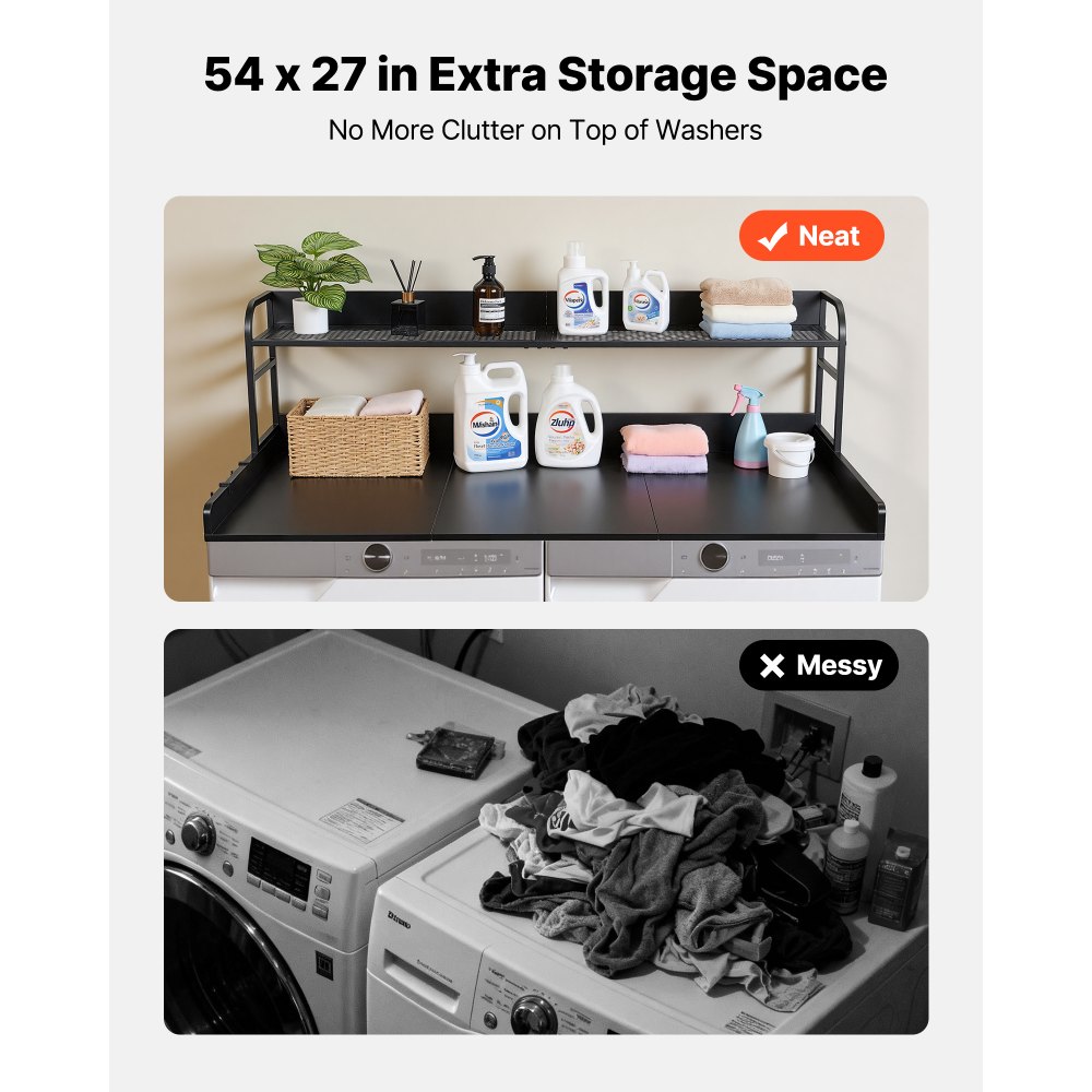 Πολυλειτουργική αποθήκευση: Αυτός ο πάγκος πλυντηρίου-στεγνωτηρίου με επιπλέον ράφι για απορρυπαντικό και αναλώσιμα, πλαϊνά άγκιστρα για ρούχα και μικρά αντικείμενα, καθώς και φαρδιά επιφάνεια για δίπλωμα και σιδέρωμα. Σταθερή στήριξη: Ο πάγκος του πλυντηρίου και του στεγνωτηρίου μας έχει διαστάσεις 53,9 x 27,5 ίντσες/137 x 69,9 εκ. για να ταιριάζει στα περισσότερα πλυντήρια και να παρέχει χώρο για πλύσιμο, ενώ η υπερυψωμένη άκρη βοηθά στην αποφυγή πτώσης των αντικειμένων. Αξιόπιστη κατασκευή: Πάγκος από μοριοσανίδα κατηγορίας P2 με ράφι από ανθρακούχο χάλυβα βαρέως τύπου, εύκολο στο σκούπισμα και καθάρισμα, αντέχει έως και 113 κιλά για την αποθήκευση ρούχων και καθημερινή χρήση. Εύκολη συναρμολόγηση: Περιλαμβάνει οδηγίες και αξεσουάρ, ρύθμιση ταχύτητας με προ-τρυπημένες τρύπες και οκτώ μαξιλαράκια λαβής στο κάτω μέρος που βοηθούν στην αποφυγή γρατσουνιών στο πάνω μέρος του πλυντηρίου ρούχων και περιορίζουν την μετατόπιση κατά τη λειτουργία. Ευέλικτη χρήση: Χρησιμοποιήστε το κάλυμμα πλυντηρίου και στεγνωτηρίου στο δωμάτιο πλυντηρίων, στο μπάνιο, στην κουζίνα ή στο μπαλκόνι, η καθαρή, μοντέρνα εμφάνιση ταιριάζει σε πολλά στυλ διακόσμησης, η λεία επιφάνεια υποστηρίζει τις καθημερινές εργασίες πλυσίματος και τις αναβαθμίσεις χώρου.