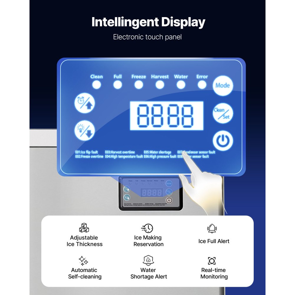 Μεγάλη Παραγωγή Πάγου: Η επαγγελματική παγομηχανή (κεφαλή) μπορεί να παράγει 450 λίβρες πάγου ανά 24 ώρες, που αντιστοιχεί σε περίπου 17.500 κομμάτια πάγου, παρέχοντας συνεχή παροχή πάγου σε μεγάλες ποσότητες. Γρήγορη Παραγωγή Πάγου: Η επαγγελματική παγομηχανή είναι εξοπλισμένη με 182 δίσκους πάγου. Μπορείτε να ρυθμίσετε το πάχος του πάγου αυξάνοντας ή μειώνοντας τον χρόνο παρασκευής πάγου. Ο ισχυρός συμπιεστής μπορεί να παράγει παγάκια σε μόλις 12-15 λεπτά. Καθαρισμός με ένα κουμπί: Η επαγγελματική μηχανή παγομηχανής διαθέτει λειτουργία αυτοκαθαρισμού με ένα άγγιγμα, παρέχοντάς σας ένα καθαρό και υγιεινό περιβάλλον παραγωγής πάγου και διασφαλίζοντας ότι οι κύβοι πάγου είναι καθαροί. Έξυπνος Πίνακας Ελέγχου: Η παγομηχανή διαθέτει ηλεκτρονική οθόνη αφής, η οποία σας επιτρέπει να ρυθμίζετε το πάχος του πάγου ρυθμίζοντας τον χρόνο παρασκευής πάγου. Μπορείτε να ξεκινήσετε τον αυτοκαθαρισμό με ένα κλικ και να παρακολουθείτε την κατάσταση παρασκευής πάγου ανά πάσα στιγμή. Κράτηση Παρασκευής Πάγου: Με τη λειτουργία κράτησης της επαγγελματικής μηχανής πάγου, μπορείτε να προγραμματίσετε πιο εύκολα και να ορίσετε τον βέλτιστο χρόνο παρασκευής πάγου με βάση τις επιχειρηματικές σας ανάγκες.