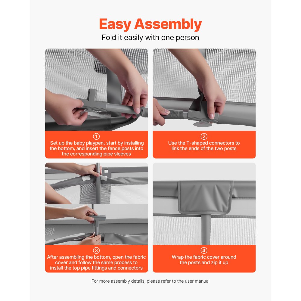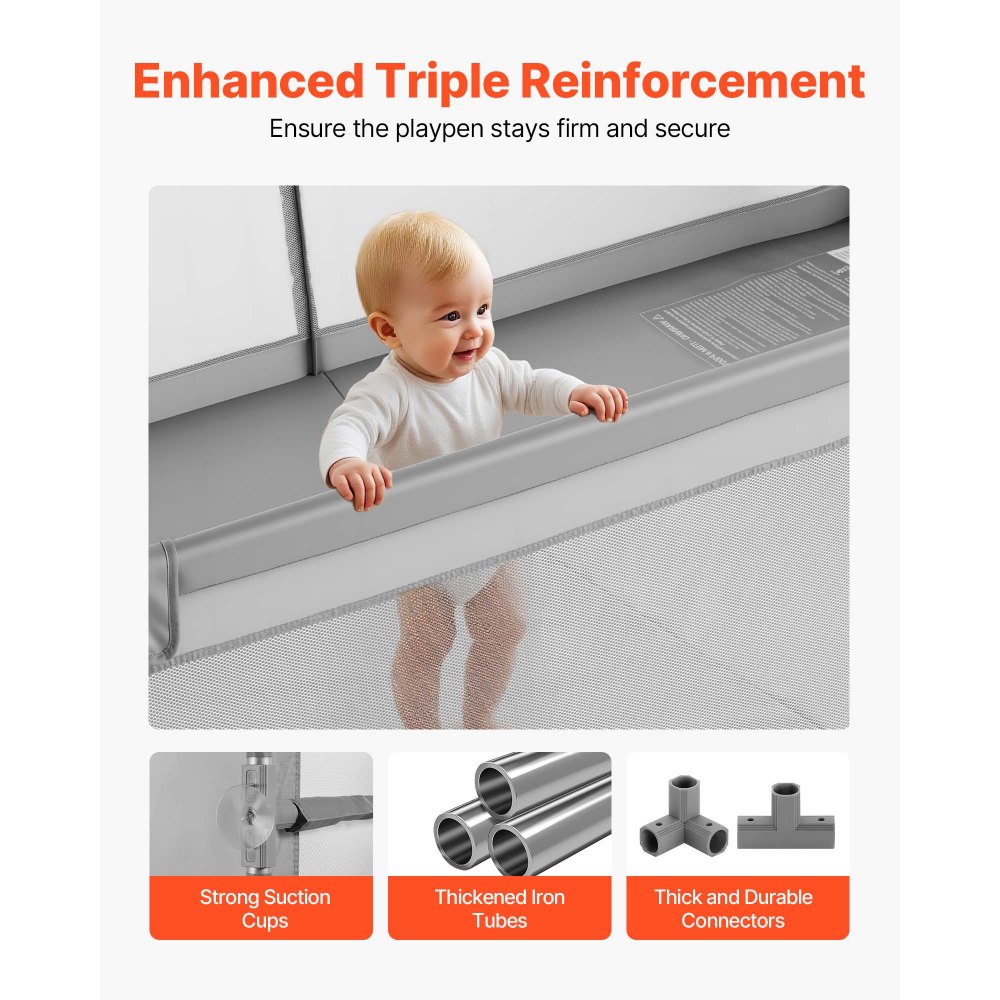 Ευρύχωρος χώρος παιχνιδιού: Με διαστάσεις 78,7 x 58,7 ίντσες (εσωτερικές διαστάσεις 2000 x 1490 χιλιοστά), αυτό το μεγάλο παιδικό παρκοκρέβατο προσφέρει άφθονο χώρο για νήπια 6-24 μηνών για να μπουσουλήσουν, να εξασκηθούν στο περπάτημα, να σταθούν όρθια και να απολαύσουν την αλληλεπίδραση γονέα-παιδιού. Αφήστε το μικρό σας να παίξει, να εξερευνήσει και να αναπτυχθεί ελεύθερα. Εξωτερικές διαστάσεις: 81,1 x 60,83 x 25,59 ίντσες (2060 x 1545 x 650 χιλιοστά) Ισχυρό και σταθερό: Εξοπλισμένο με ισχυρές βεντούζες, παχύρρευστους σωλήνες από σίδηρο και ανθεκτικούς συνδέσμους, αυτό το παιχνιδότοπο για νήπια παραμένει σταθερά στη θέση του χωρίς να μετακινείται ή να ανατρέπεται, διατηρώντας το μικρό σας ασφαλές ενώ παίζει και εξερευνά. Σημείωση: Το χαλάκι παιχνιδιού δεν περιλαμβάνεται, παρακαλούμε ετοιμάστε το ξεχωριστά. Υλικό υψηλής ποιότητας: Κατασκευασμένο από ύφασμα 210D Oxford χωρίς BPA, αυτό το κέντρο δραστηριοτήτων για μωρά με φράχτη είναι ανθεκτικό, ανθεκτικό στα σκισίματα και ασφαλές στην αφή. Το αναπνεύσιμο, διαφανές πλέγμα εξασφαλίζει εξαιρετική ροή αέρα, επιτρέποντάς σας παράλληλα να παρακολουθείτε τον μικρό σας εξερευνητή. Απολαύστε περισσότερη διασκέδαση: Η παιδική μας αυλή για μωρά και νήπια περιλαμβάνει επίσης 50 μπάλες ωκεανού, κεντρίζοντας την περιέργεια του μωρού σας, ενώ παράλληλα υποστηρίζει την αισθητηριακή ανάπτυξη και τις δεξιότητες πιασίματος. Το απαλό, άνετο υλικό εξασφαλίζει ασφάλεια και είναι απαλό στην αφή. Εύκολη εγκατάσταση και αποθήκευση: Αυτή η περίφραξη παιχνιδιού VEVOR για μωρά και νήπια συναρμολογείται γρήγορα από ένα άτομο, και διαθέτει επίσης μια τσάντα αποθήκευσης για εύκολη μεταφορά και συμπαγή αποθήκευση όταν δεν χρησιμοποιείται, εξοικονομώντας χώρο και προσθέτοντας άνεση.