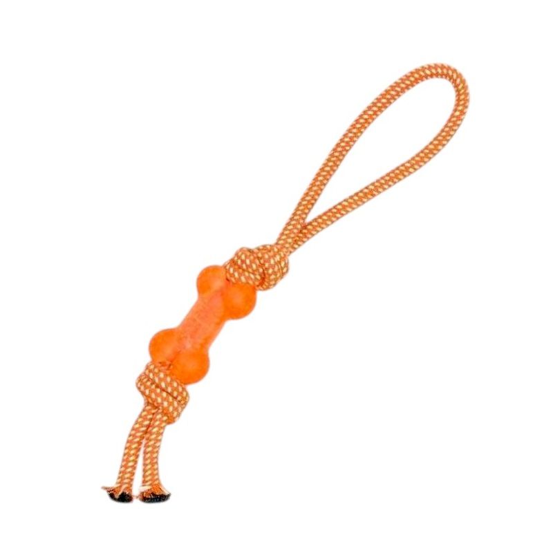 Παιχνίδι σκύλου κόκκαλο μασητικό από ανθεκτικό, ελαστικό, μη τοξικό TPR, με σχοινί με κόμπους και λαβή, συνολικού μήκους 38cm. Φροντίζει την υγεία τον δοντιών του σκύλου σας διατηρώντας τα καθαρά και μειώνοντας την πέτρα, ενώ παράλληλα διασκεδάζει παίζοντας.