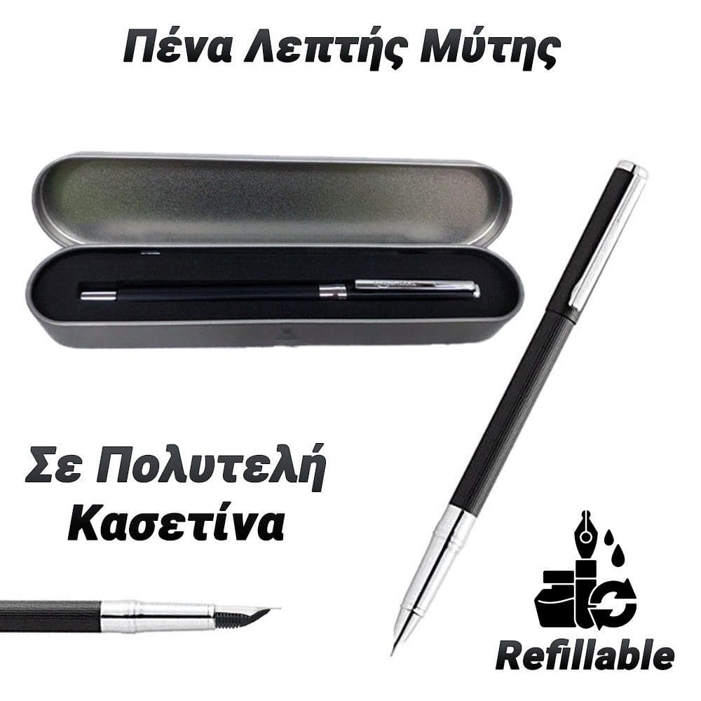 Στυλό - Πένα Λεπτής ΜύτηςΕίτε γράφετε για επαγγελματικούς λόγους είτε για διασκέδαση θα σας προσφέρει μια ομαλή ροή, εξαιρετική εμπειρία γραφής. Η λεπτή μύτη του είναι το τέλειο εργαλείο για τη δημιουργία καθαρών, ευκρινών γραμμών.Με υψηλής ποιότητας μελάνι!Ακόμη περιλαμβάνει ενσωματωμένο μεταλλικό κλιπ ώστε να το έχετε πάντα μαζί σας. Συνοδεύεται απο πολυτελή κασετίνα. Ιδανικο και για δώρο! Περιλαμβάνει 1 πένα και 1 ανταλλακτικό