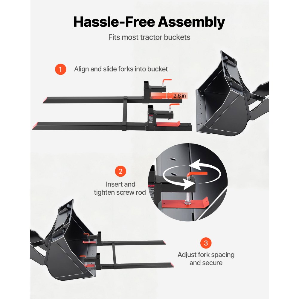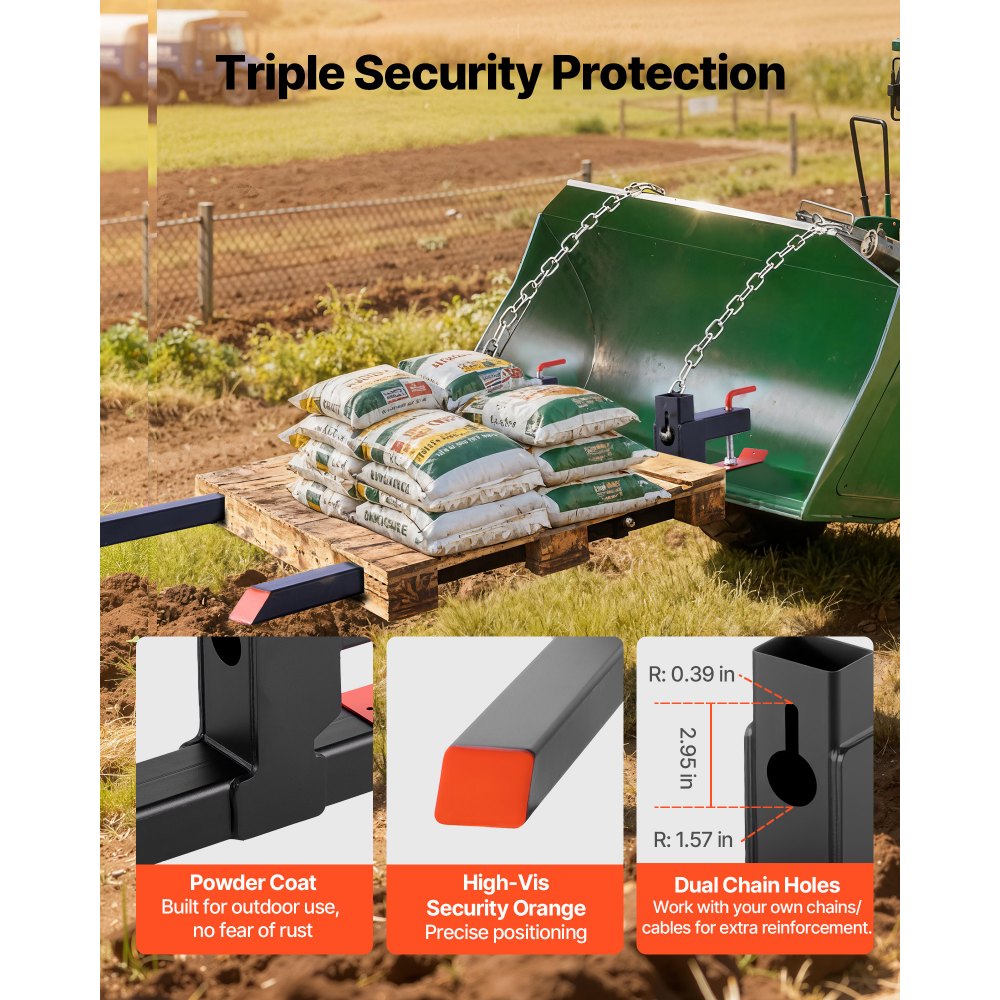 Ασφαλής ικανότητα φόρτωσης: Αυτές οι περόνες παλέτας 60 ιντσών με σφιγκτήρα ανυψώνουν έως και 907 κιλά. Τα τοιχώματα των σωλήνων πάχους 3,8 mm και οι πλευρικές ενισχυτικές νευρώσεις βοηθούν στη διαχείριση βαρέων φορτίων χωρίς κάμψη. Ισχυρό σύστημα ασφάλισης: Τέσσερις βίδες κατηγορίας 8.8 και ένα μαξιλαράκι πίεσης στις περόνες του κάδου παρέχουν ισχυρή δύναμη σύσφιξης. Η ρύθμιση βοηθά στην αποφυγή ολίσθησης και μετατόπισης κατά τη διάρκεια της εργασίας. Ρυθμιζόμενη ράβδος σταθεροποίησης: Το ρυθμιζόμενο εύρος των περονών του τρακτέρ 19,7–36 ίντσες (500–915 mm) διατηρεί τις περόνες ευθυγραμμισμένες, αποφεύγει την ολίσθηση του φορτίου και κατανέμει την πλευρική πίεση για πιο ασφαλή και ομαλότερο χειρισμό. Γρήγορη εγκατάσταση: Ο σχεδιασμός σφιγκτήρα των περονών κάδου του τρακτέρ στερεώνεται στα περισσότερα τρακτέρ, φορτωτές και πλάγιες ράγες μέσα σε λίγα λεπτά. Μετακινείτε υλικά πιο γρήγορα χωρίς να χρειάζεστε ειδικό περονοφόρο ανυψωτικό. Λεπτομέρειες ποιότητας: Ο χάλυβας Q235B και το φινίρισμα με ηλεκτροστατική βαφή των περονών παλετών μας αντέχουν σε σκληρή χρήση σε εξωτερικούς χώρους. Οι διπλές οπές αλυσίδας υποστηρίζουν επιπλέον δέσιμο, ενώ οι φωτεινές πορτοκαλί άκρες ενισχύουν την ορατότητα.