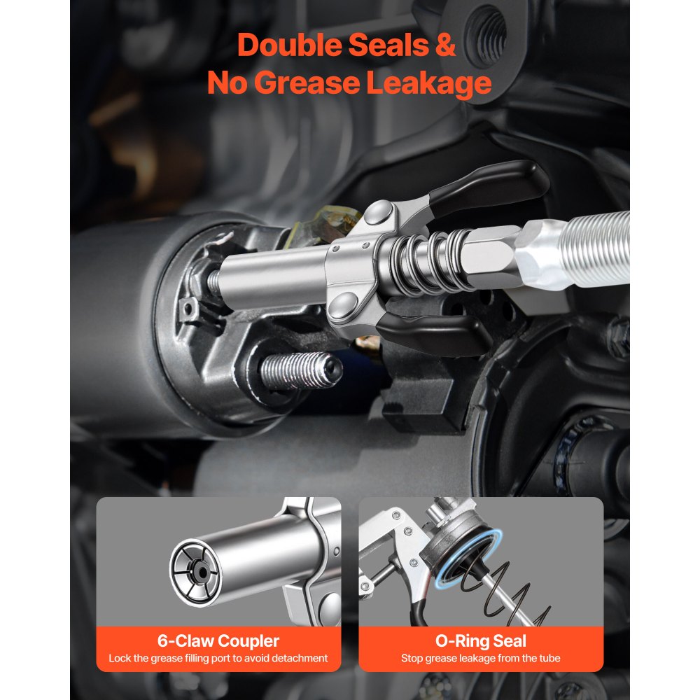Ισχυρή απόδοση: Με πίεση έως και 8.000 PSI, το πιστόλι λίπανσης 14 oz ωθεί εύκολα λιπαντικά υψηλού ιξώδους, ξεπερνώντας την αντίσταση από τα επίμονα εξαρτήματα λίπους. Εξασφαλίζει πλήρη έγχυση λιπαντικού και μειώνει τη συσσώρευση μέσα στον σωλήνα. Αξιόπιστη Σφράγιση: Ένα σύστημα διπλής στεγανοποίησης—που αποτελείται από έναν σύνδεσμο έξι σιαγόνων και ένα έμβολο o-ring εξασφαλίζει στεγανή σφράγιση χωρίς διαρροές από την κεφαλή του πιστολιού προς τον κάδο υπό υψηλή πίεση. Αυτός ο σχεδιασμός του πιστολιού λίπανσης διατηρεί τα χέρια και τις συνθήκες εργασίας καθαρά. Πλήρης Συμβατότητα: Αυτό το πιστόλι λίπανσης με λαβή πιστολιού περιλαμβάνει ένα αιχμηρό ακροφύσιο, ένα επίπεδο ακροφύσιο, έναν σύνδεσμο ασφάλισης διπλής όψης, έναν εύκαμπτο σωλήνα 18 ιντσών και έναν μεταλλικό καμπυλωτό σωλήνα. Ταιριάζει σε όλα τα μεγέθη και τις θέσεις των εξαρτημάτων λίπανσης, καλύπτοντας τις ανάγκες λίπανσης. Αποδοτική Γόμωση: Συμβατό με τυπικά φυσίγγια γράσου 14 oz, το πιστόλι λίπανσης βαρέως τύπου με πιστόλι υποστηρίζει γρήγορη πλήρωση μέσω φυσιγγίου, αντλίας ή χύμα μεθόδων. Επιτρέπει γρήγορη ανταπόκριση σε εργασίες επισκευής ή σε εργασίες έκτακτης ανάγκης συντήρησης πεδίου. Άνεση που Εξοικονομεί Κόπο: Σχεδιασμένο με εργονομική λαβή, μοχλό εξαγωγής και αντιολισθητικό λαστιχένιο περίβλημα, το επαγγελματικό πιστόλι λίπανσης με πιστολοειδή λαβή μειώνει την κόπωση των χεριών κατά τη διάρκεια παρατεταμένης χρήσης. Βελτιώνει την ακρίβεια ελέγχου και διευκολύνει τη συντήρηση της λίπανσης.