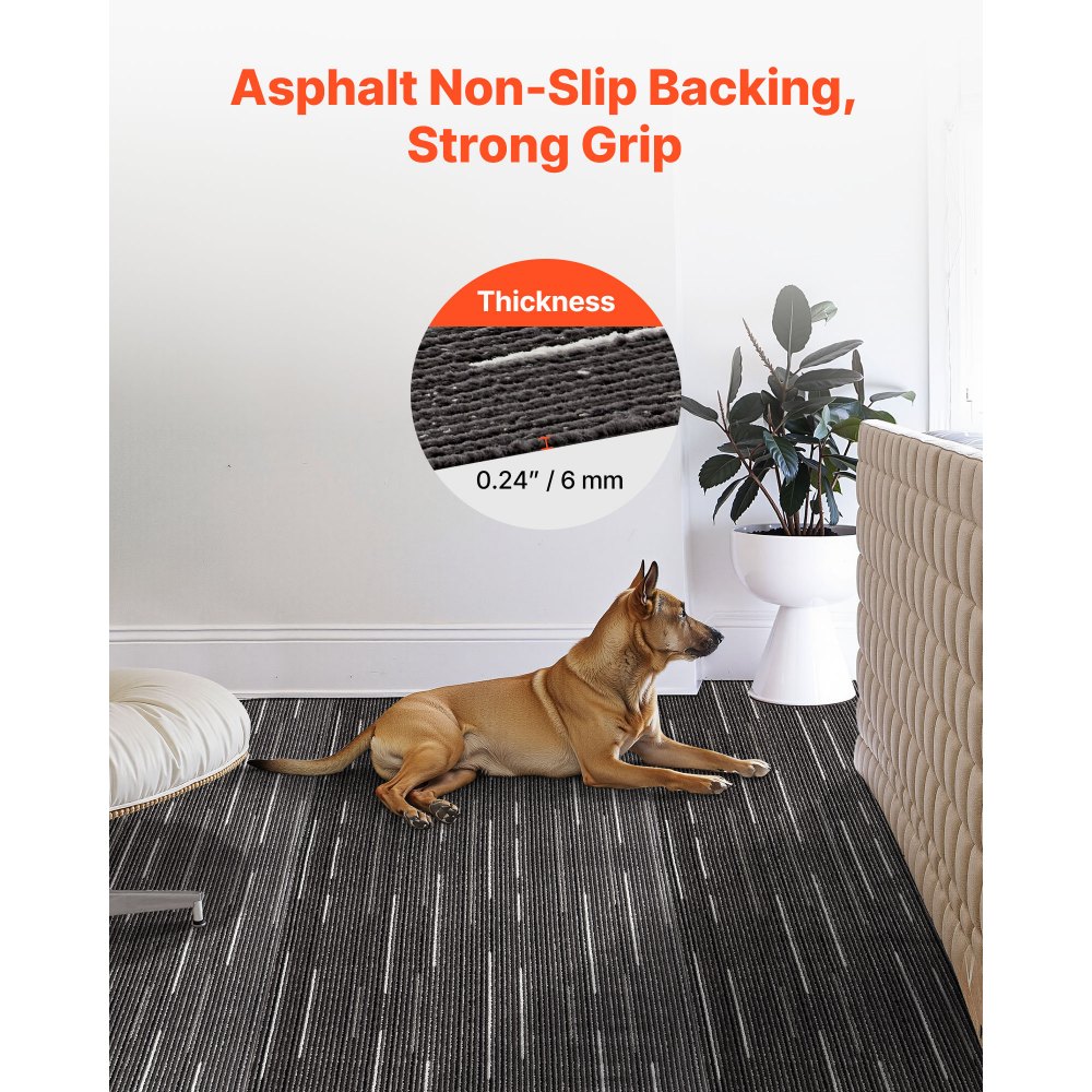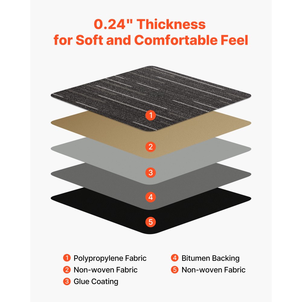 Σετ Αντικαταστάσιμων Πλακιδίων Χαλιού: Αυτό το πλήρες σετ περιλαμβάνει 24 πλακίδια χαλιού, διαστάσεων 24x24 ίντσες το καθένα. Όταν συναρμολογηθούν πλήρως, τα πλακίδια χαλιού καλύπτουν συνολική επιφάνεια 96 ft². Ο απλός σχεδιασμός χρήσης καθιστά την εγκατάσταση γρήγορη και εύκολη, ακόμη και ένα άτομο μπορεί να την κάνει. Αυτοκόλλητα τοποθέτησης που περιλαμβάνονται: Συνοδεύεται από 40 αυτοκόλλητα, δεν χρειάζεται επιπλέον κόλλα. Απλώς στερεώστε τις γωνίες και πιέστε προς τα κάτω. Γρήγορη, εύκολη και χωρίς ακαταστασία εγκατάσταση Μαλακό & Άνετο: Κάθε πλακίδιο διαθέτει κατασκευή 5 στρώσεων με στιβαρή επιφάνεια PP και πάχος 0,24 ίντσες. Η ασφαλτική επένδυση είναι αντιολισθητική και ανθεκτική στη φθορά, παρέχοντας μια απαλή, μαλακή αίσθηση κάτω από τα πόδια. Αντιολισθητική & Μακράς Διάρκειας: Σχεδιασμένα με ασφαλτική αντιολισθητική βάση, αυτά τα πλακάκια μοκέτας είναι κατασκευασμένα για σταθερότητα, αντοχή και αντοχή στην τριβή, ιδανικά για χώρους υψηλής κυκλοφορίας όπως γραφεία, διάδρομους ή χώρους ενοικίασης. Επαναχρησιμοποιήσιμα & Εύκολα στη Συντήρηση: Σε αντίθεση με τα χαλιά μεγάλων επιφανειών, αυτά τα τετράγωνα πλακάκια χαλιού μετακινούνται και αντικαθίστανται εύκολα. Απλώς αντικαταστήστε τα βρώμικα ή κατεστραμμένα πλακάκια. Εύκολο στον καθαρισμό, μακράς διαρκείας και σχεδιασμένο για επαναλαμβανόμενη χρήση.