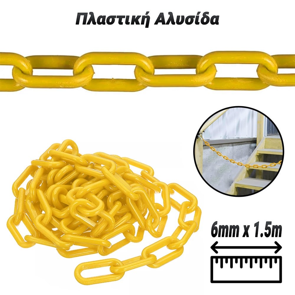 Πλαστική Αλυσίδα 6mm x 1.5m – Ελαφριά & Ανθεκτική για Πολλαπλές Χρήσεις!  Η Πλαστική Αλυσίδα 6mm x 1.5m είναι μια ανθεκτική και ελαφριά λύση για σήμανση, περίφραξη, διαχωρισμό χώρων και διακοσμητικές εφαρμογές. Χάρη στο υψηλής ποιότητας πλαστικό υλικό της, αντέχει σε εξωτερικές και εσωτερικές συνθήκες χωρίς να φθείρεται εύκολα. Χαρακτηριστικά: ✔ Διαστάσεις: 6mm πάχος – 1.5m μήκος.✔ Ανθεκτικό Υλικό: Κατασκευασμένη από υψηλής ποιότητας πλαστικό για μεγάλη διάρκεια ζωής.✔ Ελαφριά & Ευέλικτη: Εύκολη στη μεταφορά και στην προσαρμογή.✔ Αντοχή σε Καιρικές Συνθήκες: Ιδανική για εσωτερικούς & εξωτερικούς χώρους.✔ Πολλαπλές Χρήσεις: Κατάλληλη για σήμανση, οριοθέτηση χώρων, DIY κατασκευές και διακόσμηση. Αποκτήστε την Πλαστική Αλυσίδα 6mm x 1.5m για ασφαλή και πρακτική χρήση σε κάθε σας ανάγκη!