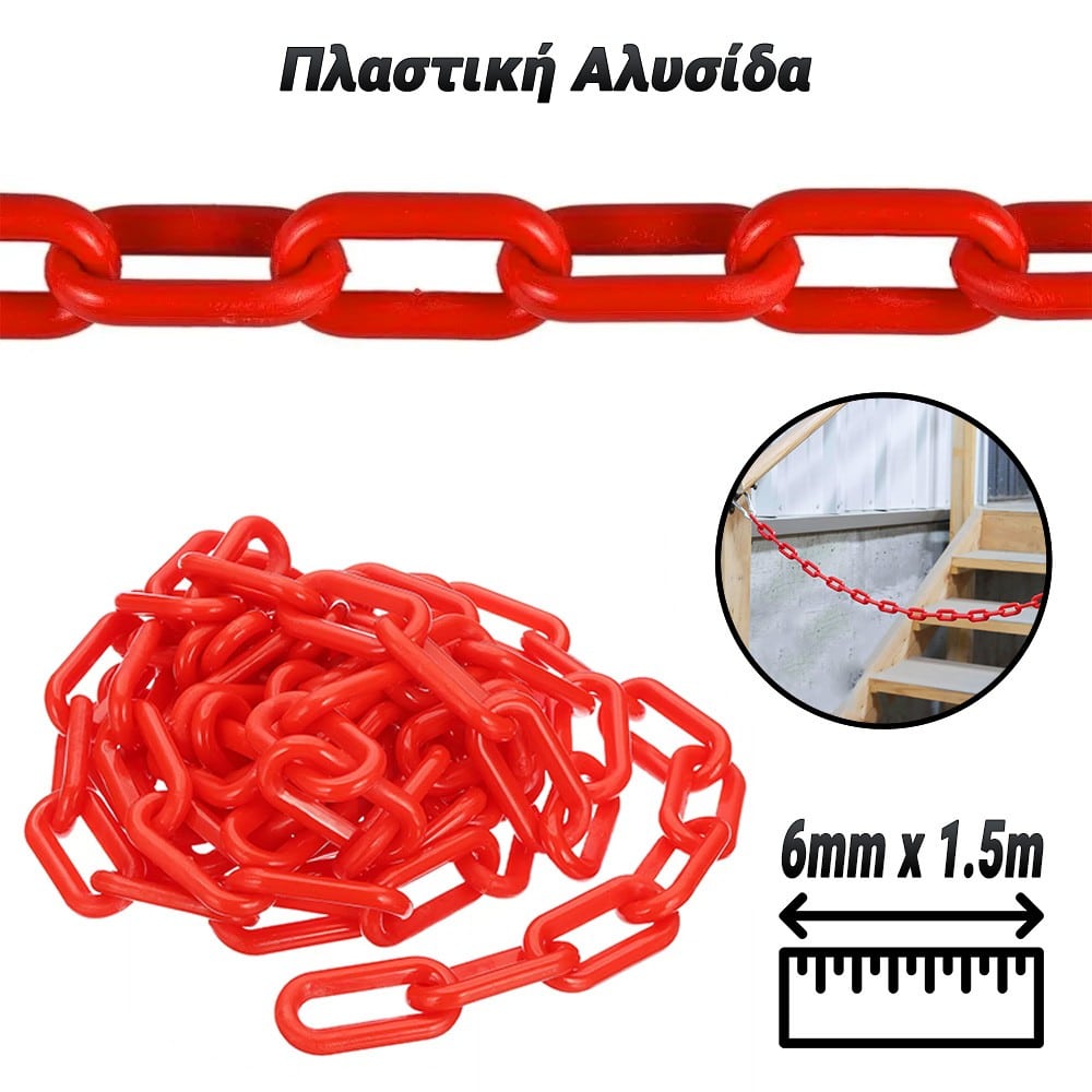 Πλαστική Αλυσίδα 6mm x 1.5m – Ελαφριά & Ανθεκτική για Πολλαπλές Χρήσεις! Η Πλαστική Αλυσίδα 6mm x 1.5m είναι μια ανθεκτική και ελαφριά λύση για σήμανση, περίφραξη, διαχωρισμό χώρων και διακοσμητικές εφαρμογές. Χάρη στο υψηλής ποιότητας πλαστικό υλικό της, αντέχει σε εξωτερικές και εσωτερικές συνθήκες χωρίς να φθείρεται εύκολα. Χαρακτηριστικά: ✔ Διαστάσεις: 6mm πάχος – 1.5m μήκος.✔ Ανθεκτικό Υλικό: Κατασκευασμένη από υψηλής ποιότητας πλαστικό για μεγάλη διάρκεια ζωής.✔ Ελαφριά & Ευέλικτη: Εύκολη στη μεταφορά και στην προσαρμογή.✔ Αντοχή σε Καιρικές Συνθήκες: Ιδανική για εσωτερικούς & εξωτερικούς χώρους.✔ Πολλαπλές Χρήσεις: Κατάλληλη για σήμανση, οριοθέτηση χώρων, DIY κατασκευές και διακόσμηση. Αποκτήστε την Πλαστική Αλυσίδα 6mm x 1.5m για ασφαλή και πρακτική χρήση σε κάθε σας ανάγκη!