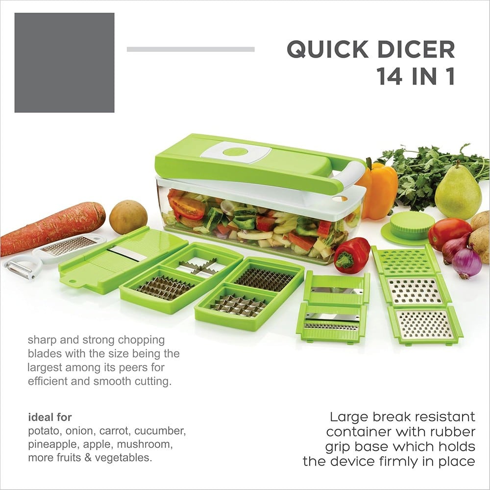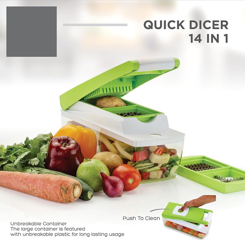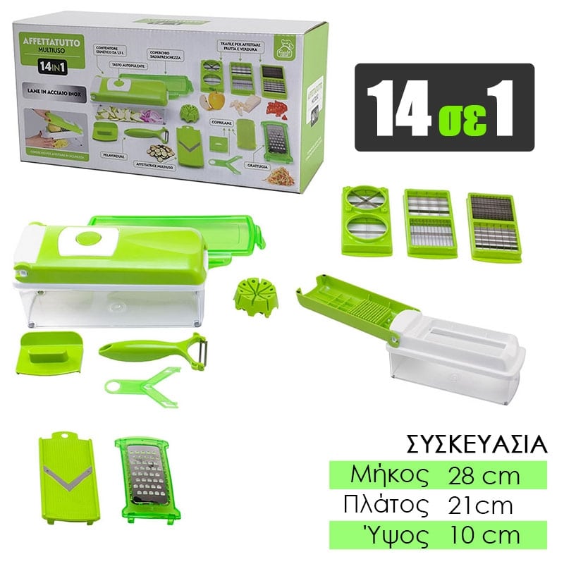 Πλήρες Σετ Κουζίνας Πολυκόφτης Λαχανικών & Φρούτων 14 σε 1 – Το Απόλυτο Πολυεργαλείο Κουζίνας! Αναβαθμίστε την καθημερινή σας προετοιμασία γευμάτων με τον ευέλικτο και εύκολο στη χρήση Πολυκόφτη Λαχανικών & Φρούτων 14 σε 1! Ιδανικός για υγιεινή διατροφή και έξυπνη οργάνωση στην κουζίνα, σας επιτρέπει να κόβετε γρήγορα και με ακρίβεια σε κύβους, φέτες, τέταρτα ή λωρίδες – όλα με μία μόνο συσκευή. ✅ Πολυλειτουργικός & Πρακτικός 14 διαφορετικές λειτουργίες κοπής: κύβοι (μεσαίοι & μεγάλοι), στικ, φέτες (λεπτές & χοντρές), λωρίδες, τέταρτα. Ιδανικός για σαλάτες, φρούτα, λαχανικά και πολλά άλλα. ✅ Υψηλής Ποιότητας Κατασκευή Ανοξείδωτες λεπίδες G-NOX: εξαιρετικά κοφτερές, ανθεκτικές στη σκουριά και μακράς διάρκειας. Καπάκι κοπής με σύστημα “Push”: ενσωματωμένη πλάκα καθαρισμού που απομακρύνει αυτόματα τα υπολείμματα τροφών. ✅ Εργονομικός & Εύκολος στη Χρήση Δεν απαιτεί ρεύμα – κόψτε γρήγορα και άνετα, οπουδήποτε. Αντιολισθητική βάση για σταθερότητα και ασφάλεια κατά τη χρήση. ✅ Έξυπνη Αποθήκευση Δοχείο συλλογής με καπάκι: για απευθείας κοπή, αποθήκευση ή μεταφορά. Ενσωματωμένος αποθηκευτικός χώρος για τα αξεσουάρ – εξοικονόμηση χώρου στην κουζίνα σας. Ανακαλύψτε έναν νέο, πιο γρήγορο και υγιεινό τρόπο να προετοιμάζετε τα γεύματά σας! Το Πλήρες Σετ Κουζίνας 14 σε 1 θα γίνει ο καλύτερός σας βοηθός στην κουζίνα.