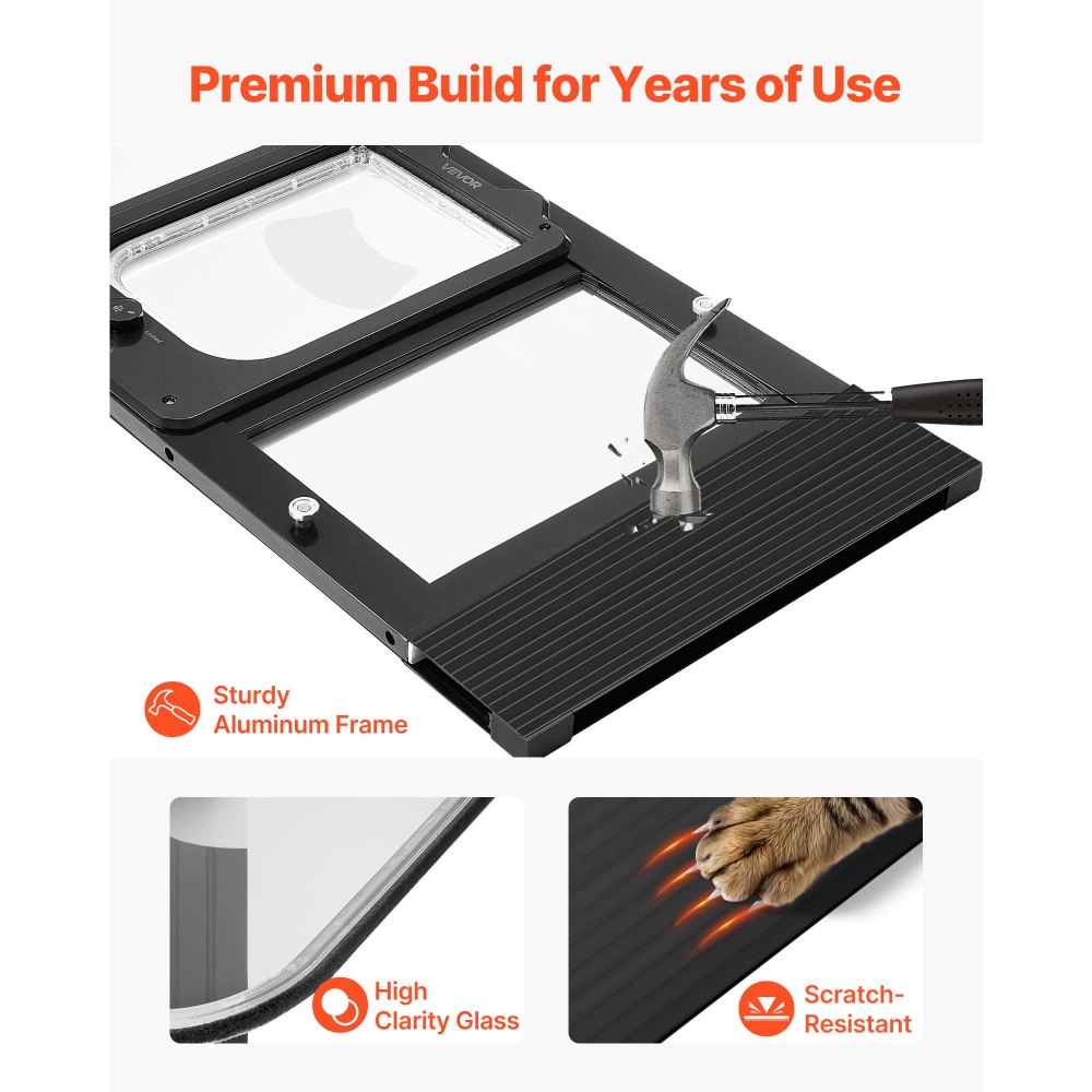 Μετρήστε πριν από την αγορά: Μετρήστε το κατοικίδιό σας και το πλαίσιο του παραθύρου πριν από την αγορά. Αυτή η πόρτα για γάτες περιλαμβάνει ρυθμιζόμενο μήκος 5 ιντσών για να εξασφαλίσει άνετη εφαρμογή για τη γάτα σας και σωστή συμβατότητα με τα παράθυρα. Σύστημα κλειδώματος 4 κατευθύνσεων: Εναλλαγή μεταξύ λειτουργίας μόνο εισόδου, μόνο εξόδου, διπλής πρόσβασης ή πλήρους κλειδώματος. Αυτή η πόρτα γατιών με παράθυρο αλουμινίου προσφέρει στη γάτα σας ευέλικτη κίνηση, ενώ παράλληλα βοηθά στη διατήρηση ενός ήρεμου περιβάλλοντος στο σπίτι. Ομαλό αυτόματο κλείσιμο και στεγανή σφράγιση: Το μαγνητικό πτερύγιο συνδυάζεται με μια άκρη με επένδυση βουρτσίσματος για ομαλό, αθόρυβο αυτόματο κλείσιμο και ασφαλή σφράγιση. Η πόρτα παραθύρου για κατοικίδια βοηθά να διατηρείται ο εσωτερικός σας χώρος ζεστός και καθαρός καθώς η γάτα σας κινείται. Εγκατάσταση χωρίς εργαλεία: Δεν χρειάζεται τρύπημα. Απλώς τοποθετήστε την πόρτα κατοικίδιων για το παράθυρο στη ράγα του παραθύρου, σφίξτε τα πόμολα και απολαύστε μια γρήγορη, τακτοποιημένη εγκατάσταση. Πλαίσιο από κράμα αλουμινίου υψηλής ποιότητας: Κατασκευασμένο με στιβαρό πλαίσιο από κράμα αλουμινίου και ένα διαφανές, ανθεκτικό στις γρατσουνιές πτερύγιο, αυτό το παράθυρο πόρτας για γάτες αντέχει στην καθημερινή χρήση και στις περίεργες περιπέτειες της γάτας σας.