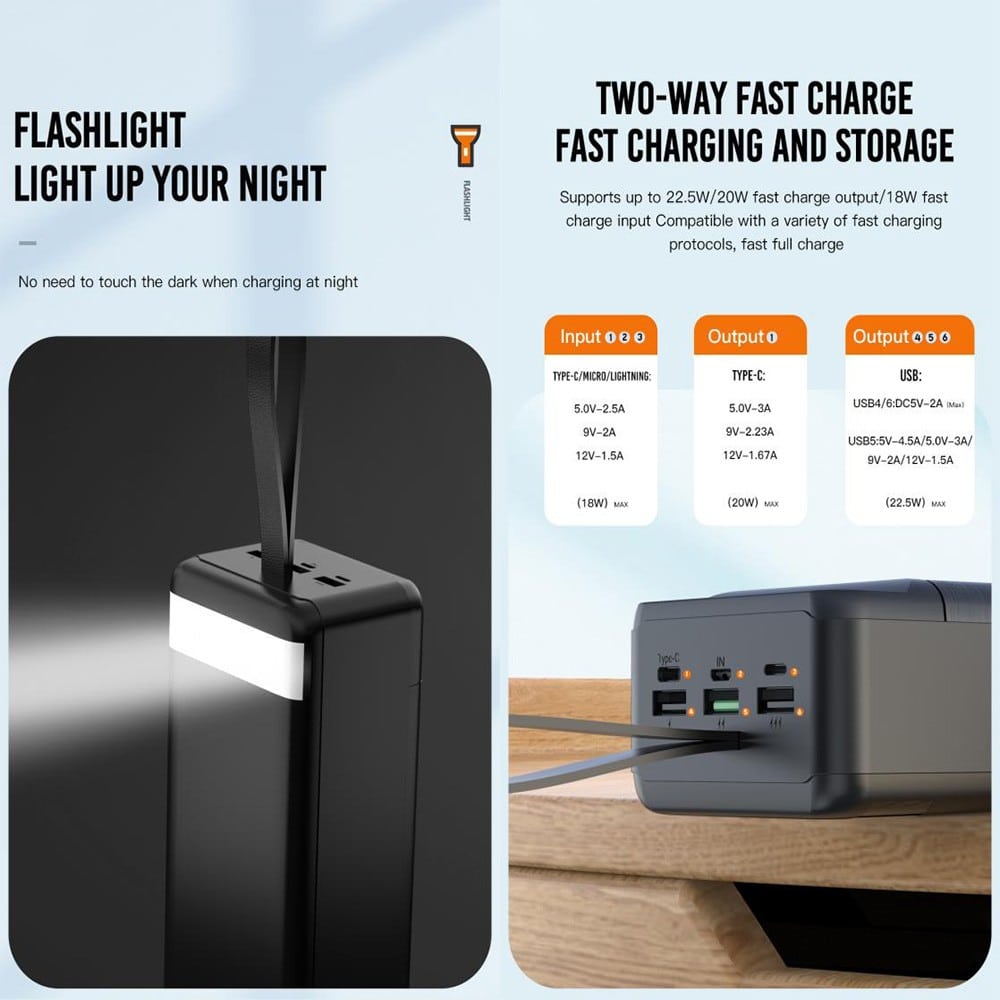 Το Power Brick 60000mAh Fast Charge με Ισχυρό Φακό είναι ο ιδανικός φορητός φορτιστής για όσους χρειάζονται αξιόπιστη και ισχυρή ενέργεια εν κινήσει. Με τεράστια χωρητικότητα 60000mAh, αυτό το power brick σας επιτρέπει να φορτίζετε τα smartphone, τα tablets, και άλλες συσκευές σας πολλές φορές, χωρίς την ανάγκη συνεχούς πρόσβασης σε πρίζα. Χαρακτηριστικά: Χωρητικότητα: 60000mAh, για πάρα πολλές πλήρεις φορτίσεις των συσκευών σας Οθόνη: Ένδειξη LCD που δείχνει με ακρίβεια το επίπεδο της μπαταρίας, ώστε να γνωρίζετε πάντα πόση ενέργεια απομένει Συμβατότητα: Συμβατό με όλες τις συσκευές που φορτίζουν μέσω USB, όπως smartphones, tablets, ακουστικά, και άλλες φορητές συσκευές Έξοδοι USB: Πολλαπλές έξοδοι USB για ταυτόχρονη φόρτιση περισσότερων συσκευών Φόρτιση: Υποστηρίζει γρήγορη φόρτιση για να ανακτάτε την ενέργεια των συσκευών σας σε ελάχιστο χρόνο Σχεδίαση: Κομψό και ανθεκτικό περίβλημα, σχεδιασμένο για καθημερινή χρήση και εύκολη μεταφορά Το Power Brick 60000mAh Fast Charge με Ισχυρό Φακό είναι η τέλεια λύση για όσους χρειάζονται μεγάλη αυτονομία ενέργειας χωρίς να θυσιάζουν την άνεση και την ευκολία. Είτε βρίσκεστε σε ταξίδι, είτε απλώς στην καθημερινότητά σας, αυτό το power brick θα σας εξασφαλίσει ότι οι συσκευές σας θα είναι πάντα πλήρως φορτισμένες και έτοιμες για χρήση. Επιλέξτε το Power Brick 60000mAh για να μην μείνετε ποτέ χωρίς ενέργεια, ανεξάρτητα από το πού βρίσκεστε. * Fast Charging Protocols:- Input: PD3.0/PD2.0, AFC, FCP- Output: PPS/PD3.0/PD2.0. QC3.0/QC2.0, AFC. FCP* Input: 1 x Type-C- Power: 5V/2.5A- Power: 18W* Input: 1 x Micro USB- Power: 9V/2A- Power: 18W* Input: 1 x Lightning- Power: 12V/1.5A- Power: 18W* Output: 1 x Type-C- Power: 5V/3A 9V/2.23A 12V/1.67A- Power: 20W* Output: 2 x USB-A- Power: DC 5V/2A- Power: 22.5W* Output: 1 x USB-A- Power: 5V-4.5A/5.0V-3A/9V-2A/12V-1.5A- Power: 22.5W* Digital Display* Product size: 168 x 82.5 x 62 mm* Weight: 1399 g
