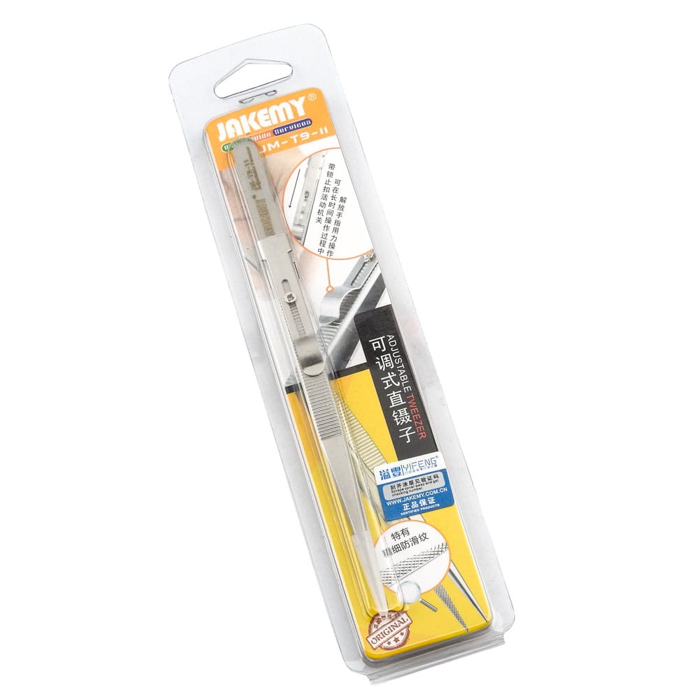 Ίσια επιμήκης προσέλα JM-T9-11 από την JAKEMY. Μια ίσια αντιστατική προσέλα η όποια δίνει την δυνατότητα ρύθμισης με βίδα για να κρατάει τα ηλεκτρονικά αντικείμενα. Ένα χρήσιμο και απαραίτητο εργαλείο για όλα τα εργαστήρια ηλεκτρονικών και τεχνικών Η/Υ. Χαρακτηριστικά: Κατασκευασμένο από ανοξείδωτο χάλυβα SUD 202 Εργονομικό υψηλής ακρίβειας με αντιολισθητική λαβή αντιμαγνητικό και αντιστατικό Μήκους: 165mm DOA 14 ημερών