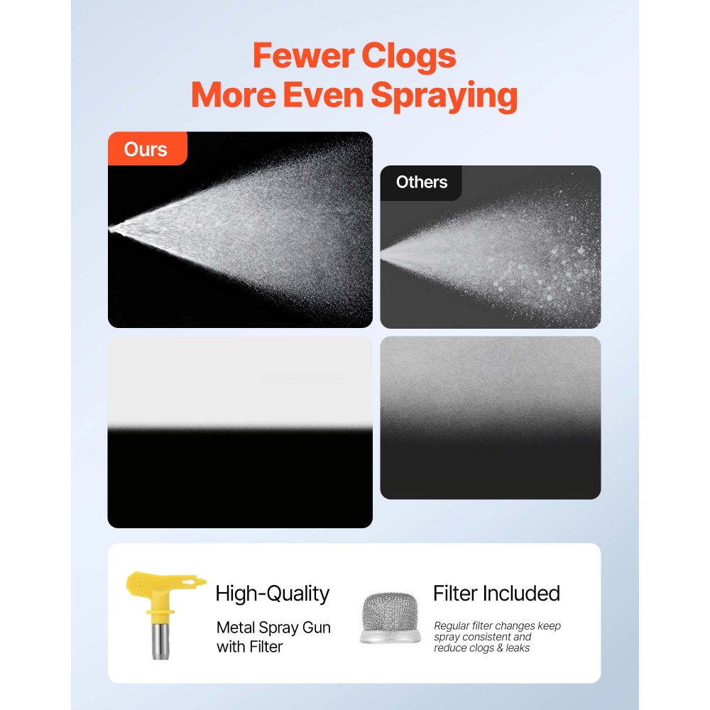 Αποδοτική Επίστρωση: Ο κινητήρας 1500W, η ροή 0,7 GPM και η πίεση 3300 PSI προσφέρουν ταχύτητες ψεκασμού 8 φορές μεγαλύτερες από τους κυλίνδρους και 20 φορές μεγαλύτερες από τις βούρτσες. Ο ψεκαστήρας βαφής χωρίς αέρα με σταντ είναι ιδανικός για έργα μεγάλης κλίμακας, όπως συγκροτήματα διαμερισμάτων και κτίρια. Έξυπνη φωνητική διάγνωση: Όταν ο ψεκαστήρας βαφής χωρίς αέρα αντιμετωπίσει κάποια ανωμαλία, η λειτουργία έξυπνης φωνητικής διάγνωσης ενεργοποιείται αμέσως, ανακοινώνοντας με σαφήνεια τον τύπο σφάλματος για να σας βοηθήσει να εντοπίσετε και να επιλύσετε γρήγορα το πρόβλημα, ελαχιστοποιώντας τον χρόνο επισκευής. Εύκολος καθαρισμός και συντήρηση: Αυτή η μηχανή βαφής με ψεκασμό περιλαμβάνει μια βούρτσα καθαρισμού για απλή συντήρηση. Το αποσπώμενο σώμα της αντλίας και τα αξεσουάρ απλοποιούν την αντικατάσταση και τη συντήρηση, διατηρώντας τον εξοπλισμό σε άριστη κατάσταση. Βολικός σχεδιασμός: Η τροχήλατη βάση του ψεκαστήρα χωρίς αέρα εξασφαλίζει ομαλή κινητικότητα, ενώ ο στύλος φτάνει σε ψηλές και χαμηλές επιφάνειες, μειώνοντας την ανάγκη για αναρρίχηση ή κάμψη. Ο εύκαμπτος σωλήνας αναρρόφησης αντλεί χρώμα από κουβάδες 1 έως 5 γαλονιών για ευέλικτη λειτουργία. Ανθεκτικό και αξιόπιστο: Ο ψεκαστήρας υψηλής πίεσης χωρίς αέρα διαθέτει ρυθμιζόμενο κινητήρα, επαγγελματικό ελαστικό σωλήνα και μεταλλικό πλαίσιο για την ελαχιστοποίηση των βλαβών και την εξασφάλιση αξιόπιστης απόδοσης, διατηρώντας τα έργα σας ομαλά από την αρχή μέχρι το τέλος.