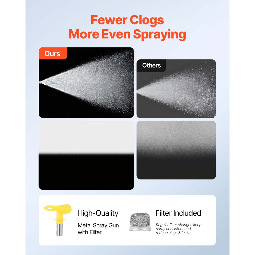Αποδοτική Επίστρωση: Ο κινητήρας 900W, η ροή 0,47 GPM και η πίεση 3300 PSI προσφέρουν ταχύτητες ψεκασμού 6 φορές μεγαλύτερες από τους κυλίνδρους και 15 φορές μεγαλύτερες από τις βούρτσες. Ο ψεκαστήρας βαφής χωρίς αέρα με σταντ είναι ιδανικός για έργα μεγάλης κλίμακας, όπως μεζονέτες και εργοστασιακά κτίρια. Ιδανικό φινίρισμα επίστρωσης: Το ακροφύσιο υψηλής ποιότητας εξασφαλίζει ακριβή έλεγχο και ελαχιστοποιεί τον υπερβολικό ψεκασμό. Ο ψεκαστήρας βαφής χωρίς αέρα περιλαμβάνει φίλτρο και στεγανοποιήσεις για την αποφυγή φραγμού και διαρροών, προσφέροντας ομαλή και ομοιόμορφη κάλυψη. Εύκολος καθαρισμός και συντήρηση: Αυτή η μηχανή βαφής με ψεκασμό περιλαμβάνει μια βούρτσα καθαρισμού για απλή συντήρηση. Το αποσπώμενο σώμα της αντλίας και τα αξεσουάρ απλοποιούν την αντικατάσταση και τη συντήρηση, διατηρώντας τον εξοπλισμό σε άριστη κατάσταση. Βολικός σχεδιασμός: Ο ελαφρύς ψεκαστήρας χωρίς αέρα εξασφαλίζει εύκολη κίνηση, ενώ ο στύλος φτάνει σε ψηλές και χαμηλές επιφάνειες, μειώνοντας την ανάγκη για αναρρίχηση ή κάμψη. Ο εύκαμπτος σωλήνας αναρρόφησης τραβάει χρώμα από κουβάδες 1 έως 5 γαλονιών για ευέλικτη λειτουργία. Ανθεκτικό και αξιόπιστο: Ο ψεκαστήρας υψηλής πίεσης χωρίς αέρα διαθέτει ρυθμιζόμενο κινητήρα, επαγγελματικό ελαστικό σωλήνα και μεταλλικό πλαίσιο για την ελαχιστοποίηση των βλαβών και την εξασφάλιση αξιόπιστης απόδοσης, διατηρώντας τα έργα σας ομαλά από την αρχή μέχρι το τέλος.