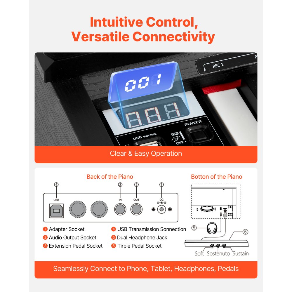 Ρεαλιστική αφή και ήχος: Διαθέτοντας ένα πλήρες πληκτρολόγιο 88 πλήκτρων με πλήρη βαρύτητα, δράση σφυριού και ευαισθησία αφής 3 επιπέδων, αυτό το πιάνο με βαρύτητα προσομοιώνει αυθεντικά την αίσθηση ενός ακουστικού πιάνου. Ιδανικό για αρχάριους και για καθημερινό παίξιμο. Πλούσιος ήχος υψηλής πιστότητας: Εξοπλισμένο με τη μηχανή ήχου French DREAM και το σύστημα διπλών ηχείων, αυτό το ψηφιακό πιάνο με 88 πλήκτρα προσφέρει καθαρό, γεμάτο ήχο που αναπαράγει με ακρίβεια τους λεπτούς τόνους ενός πιάνου με ουρά. Έξυπνη εμπειρία εκμάθησης: Αυτό το ηλεκτρικό πιάνο με 88 πλήκτρα υποστηρίζει ασύρματη συνδεσιμότητα και διάφορες εφαρμογές και συσκευές. Προσφέρει 600 ρυθμούς, 680 τόνους και 200 τραγούδια demo, καθιστώντας την εκμάθηση εύκολη και αποτελεσματική. Σχεδιασμός διπλού πληκτρολογίου: Η λειτουργία διπλού πληκτρολογίου επιτρέπει στους εκπαιδευτικούς να καθοδηγούν οπτικά και να επιδεικνύουν τεχνικές. Αυτό το πληκτρολόγιο 88 πλήρως σταθμισμένων πλήκτρων επιτρέπει στους μαθητές να μιμούνται άμεσα ρυθμούς και δεξιότητες για ταχύτερη πρόοδο. Κομψή εμφάνιση: Αυτό το πληκτρολόγιο πιάνου με βάρη διαθέτει μοντέρνα, μινιμαλιστική εμφάνιση με απαλές, καθαρές γραμμές που ταιριάζουν άψογα σε κάθε διακόσμηση σπιτιού. Αναβαθμίζει το σαλόνι ή τη μουσική σας γωνιά με μια εκλεπτυσμένη καλλιτεχνική πινελιά.
