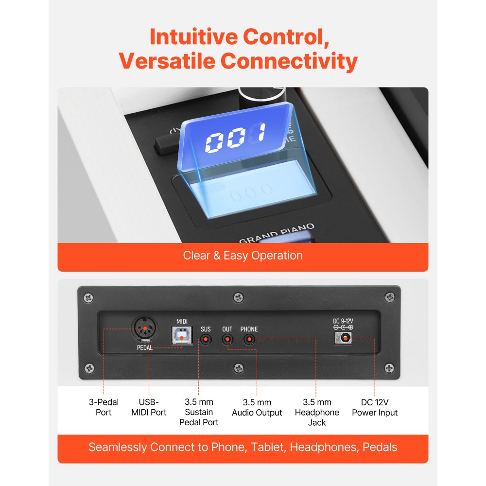 Ψηφιακό πιάνο VEVOR με βάρη, 88 πλήκτρα με πλήρη βάρη, ηλεκτρικό πληκτρολόγιο πιάνου με βάση επίπλωσης, τροφοδοτικό, τριπλό πεντάλ, λειτουργία εγγραφής, 280 τόνοι, ασύρματη σύνδεση, για αρχάριους, λευκό