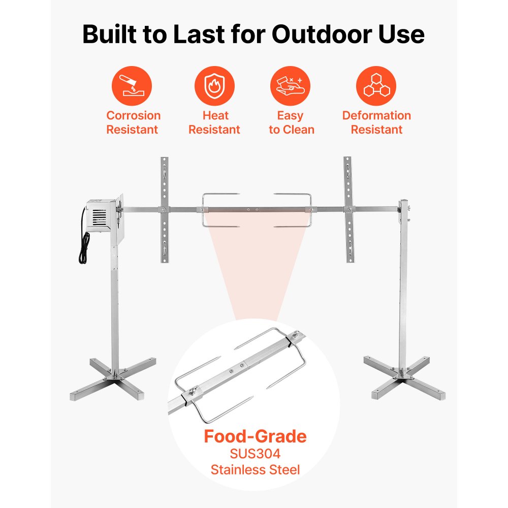 Ομαλή περιστροφή 360°: Απολαύστε ομαλή περιστροφή με αυτό το κιτ σούβλας που τροφοδοτείται από κινητήρα 38W στις 3 σ.α.λ. Τα διπλά ρουλεμάν μειώνουν την καταπόνηση του κινητήρα, ενώ ο αναβαθμισμένος ανεμιστήρας ψύξης και το προστατευτικό κάλυμμα διατηρούν τη μονάδα σε αποτελεσματική λειτουργία για ομοιόμορφα μαγειρεμένα γεύματα. Βαρέως τύπου χωρητικότητα: Σχεδιασμένη για να χειρίζεται βάρος έως και 60 κιλά, το πλαίσιο αυτής της σούβλας ψησίματος 52 ιντσών/1321 χιλιοστών χωράει χοίρους, αρνιά, γαλοπούλες και άλλα. Ιδανική για τη δημιουργία μεγάλων, ομοιόμορφα μαγειρεμένων γευμάτων που εντυπωσιάζουν την οικογένεια και τους φίλους σε οποιαδήποτε συγκέντρωση. Κατασκευή από ανοξείδωτο ατσάλι: Κατασκευασμένο από ανθεκτικό ανοξείδωτο ατσάλι, αυτό το κιτ σούβλας VEVOR εξασφαλίζει αντοχή στη σκουριά και εύκολο καθάρισμα. Εξοπλισμένο με πιρούνια SUS304 για επαφή με τρόφιμα, χειρίζεται το έντονο μαγείρεμα σε εξωτερικούς χώρους με σταθερότητα και αποτελεσματικότητα. Σύστημα ρυθμιζόμενου ύψους: Το κιτ ψησίματος μπάρμπεκιου προσφέρει 8 επίπεδα ύψους για ευέλικτο έλεγχο της απόστασης θερμότητας και της θερμοκρασίας μαγειρέματος. Το ενισχυμένο τρίποδο 45° με βάσεις στήριξης εξασφαλίζει σταθερή στήριξη ακόμα και σε γρασίδι ή μαλακές επιφάνειες για εύκολο ψήσιμο σε εξωτερικούς χώρους. Ψησταριά πολλαπλών σκηνών: Απολαύστε ένα φορητό κιτ αυτόματης ψησίματος κατάλληλο για πάρτι στην αυλή, γαμήλιες δεξιώσεις, κάμπινγκ ή εορταστικές εκδηλώσεις. Η απλή συναρμολόγηση επιτρέπει το ψήσιμο ολόκληρων χοίρων, αρνιών, γαλοπούλων και βοδινού στήθος χωρίς κόπο.