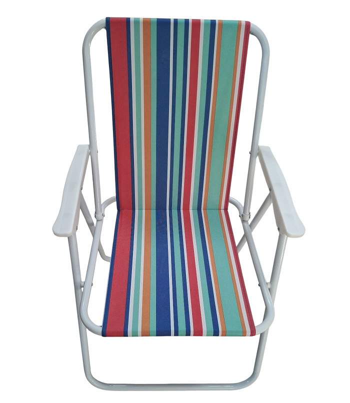 Πτυσσόμενη καρέκλα camping, με μπράτσα, και αδιάβροχο ύφασμα που καθαρίζεται εύκολα. Στιβαρός σιδερένιος σκελετός που διπλώνει με μία κίνηση, για εύκολη μεταφορά και αποθήκευση. Διαθέτει αντιολισθητικά πατάκια. Ιδανική για την παραλία, το camping, το ψάρεμα, τον κήπο κα.