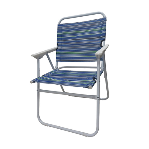 Πτυσσόμενη καρέκλα παραλίας-camping, με πλάτη, μπράτσα και αδιάβροχο ύφασμα που καθαρίζεται εύκολα.