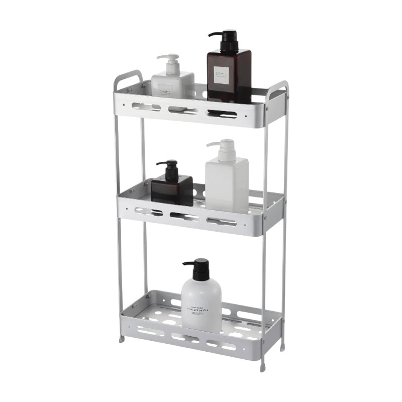 Ραφιέρα μπάνιου τριώροφη, επιδαπέδια, με μεταλλικό σκελετό αλουμινίου και πρακτικό σχεδιασμό. Διαθέτει προστατευτικά αντιολισθητικά πατάκια.