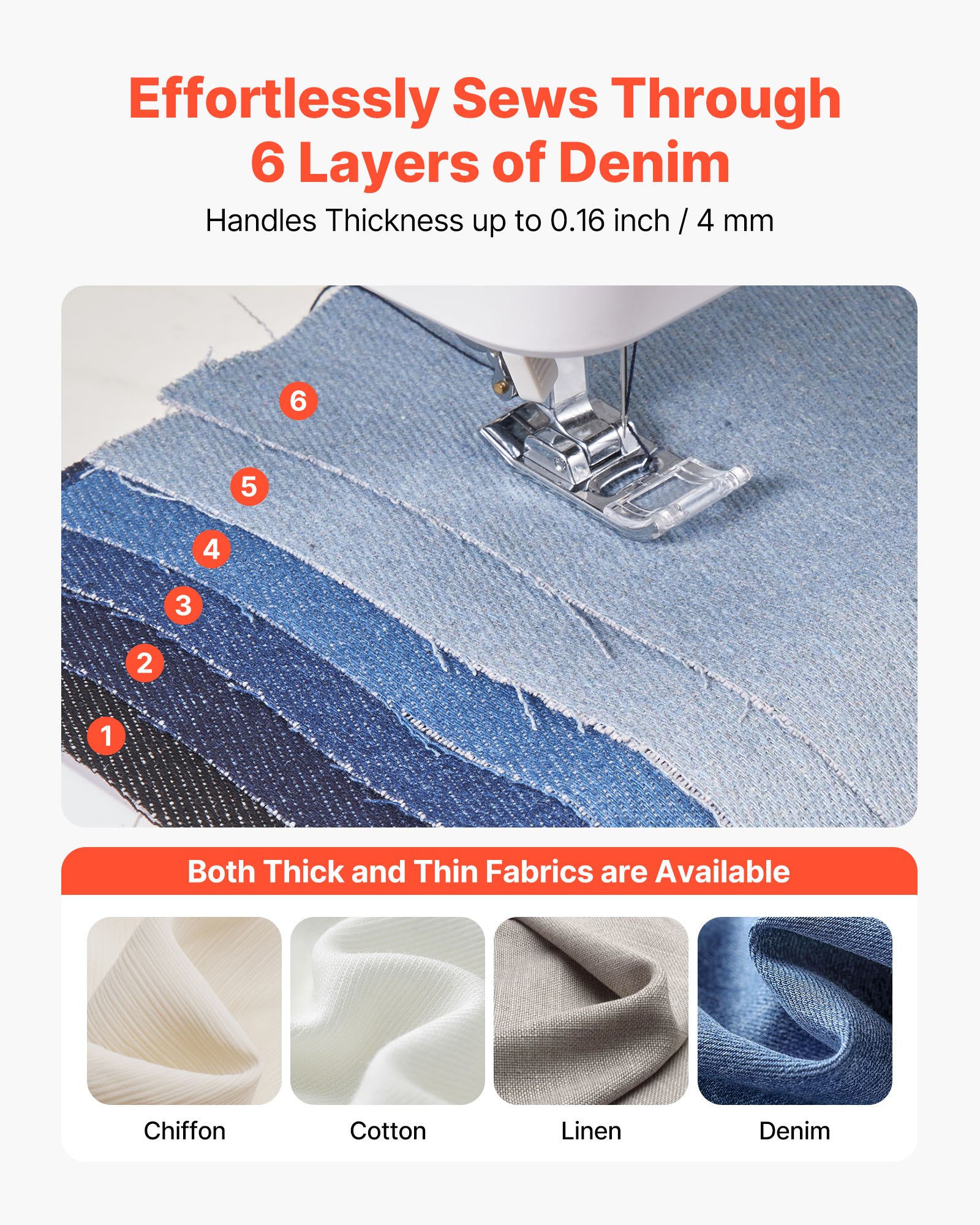 Χειρίζεται Χοντρά Υφάσματα: Κατασκευασμένη με μεταλλικό σκελετό ανθεκτικής κατασκευής, βάση από ανοξείδωτο ατσάλι και ισχυρό κινητήρα, η ψηφιακή μας ραπτομηχανή ράβει έως και 0,16 ίντσες χοντρά υφάσματα - όπως 6 στρώσεις τζιν - χειρίζεται εύκολα τόσο λεπτά σιφόν όσο και χοντρά τζιν.