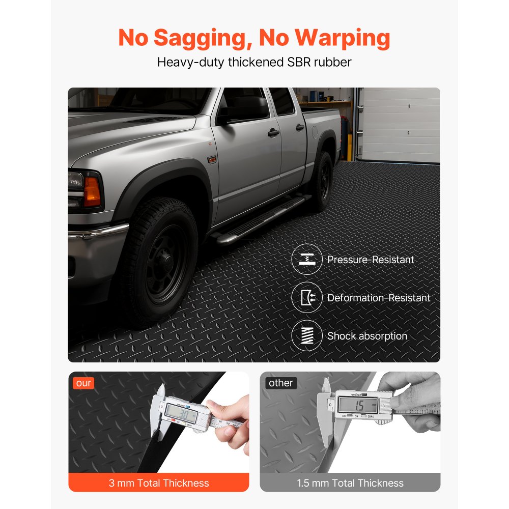 Μεγαλύτερη Κάλυψη: Αυτό το ρολό δαπέδου γκαράζ έχει διαστάσεις 4 x 20 ft / 1219,2 x 6096 mm με επιφάνεια 80 τετραγωνικά πόδια, κατάλληλο για μεσαίου μεγέθους SUV, συμπαγή SUV, σπορ αυτοκίνητα, μοτοσικλέτες και αμαξίδια γκολφ, ενώ είναι επίσης ιδανικό για αποθήκες, πορτμπαγκάζ ή πεζοδρόμια. Μετρήστε το μέγεθος πριν από την αγορά. Ελαστικό SBR βαρέως τύπου: Αυτό το χαλάκι δαπέδου γκαράζ είναι κατασκευασμένο από ελαστικό SBR βαρέως τύπου πάχους 3 mm, παρέχοντας εξαιρετική αντοχή στη φθορά και την πίεση. Αντέχει σε ρυμουλκούμενα, φορτηγά και βαρέα οχήματα χωρίς παραμόρφωση, εξασφαλίζοντας μακροχρόνια χρήση. Σταθερό και αντιολισθητικό: Η επιφάνεια με μοτίβο διαμαντιού αυτού του ρολού πατακιού γκαράζ έχει σχεδιαστεί για αντιολισθητική προστασία, εξασφαλίζοντας ασφαλές περπάτημα και στάθμευση ακόμη και σε υγρές συνθήκες. Εφαρμόστε ταινία διπλής όψης (δεν περιλαμβάνεται) γύρω από τις άκρες για ισχυρότερη και διαρκή πρόσφυση. Εύκολος καθαρισμός: Κατασκευασμένος από αδιάβροχο ελαστικό στρώμα επιφάνειας, αυτός ο κύλινδρος δαπέδου γκαράζ είναι ανθεκτικός στη βρωμιά, τη λάσπη, τα υγρά των οχημάτων και τα χημικά, διατηρώντας τον χωρίς λεκέδες. Απλώς καθαρίστε με ηλεκτρική σκούπα, σφουγγαρίστρα ή υγρό πανί, διατηρώντας την επιφάνεια φρέσκια ακόμα και υπό έντονη χρήση. Εύκολη εγκατάσταση και κοπή: Αυτά τα χαλάκια δαπέδου γκαράζ είναι εύκολα στην τοποθέτηση για ένα λείο, ομοιόμορφο δάπεδο. Μπορεί να κοπεί με ψαλίδι ή ένα μαχαίρι γενικής χρήσης σε οποιοδήποτε σχήμα ή μέγεθος, παρέχοντας εξαιρετική κάλυψη δαπέδου για οποιαδήποτε περιοχή.
